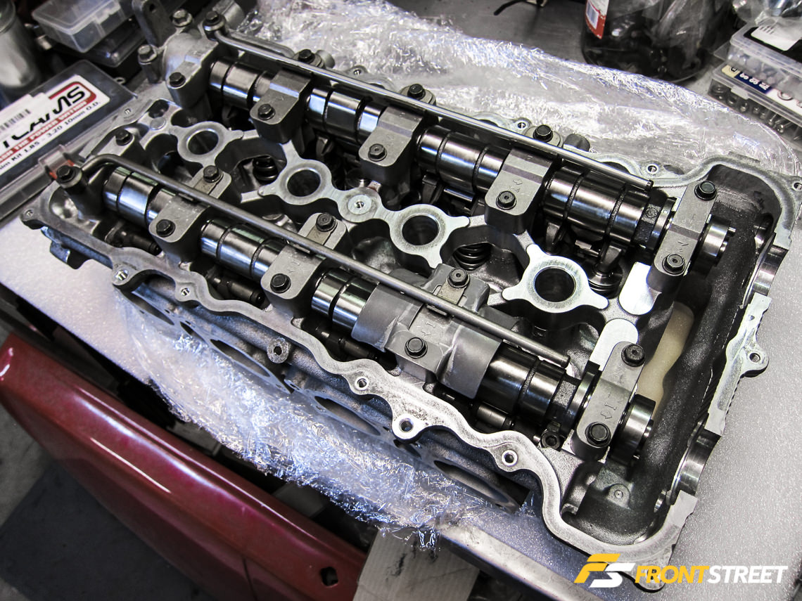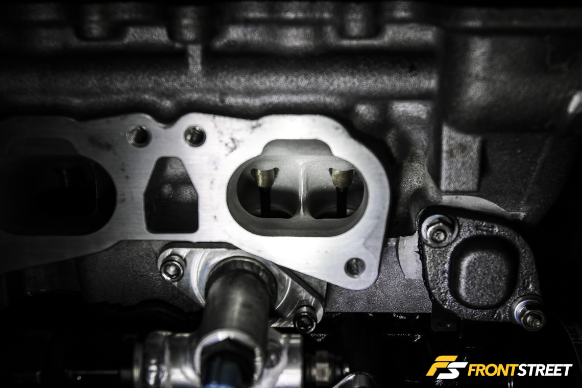 All Tomei metal head gaskets are made from a triple layer, super grommet design. Installing the gasket required us to modify the piece by slightly cutting and grinding the area where the front cover and cylinder head meet due to using the VVL front cover. Since this was an area of the gasket that wasn’t witnessing a large area of clamping force, the necessary modifications were deemed harmless to the engine’s performance. I should also note that the pistons were specifically designed by JE for the 1.2mm head gasket thickness to achieve the target 11.5:1 compression ratio.