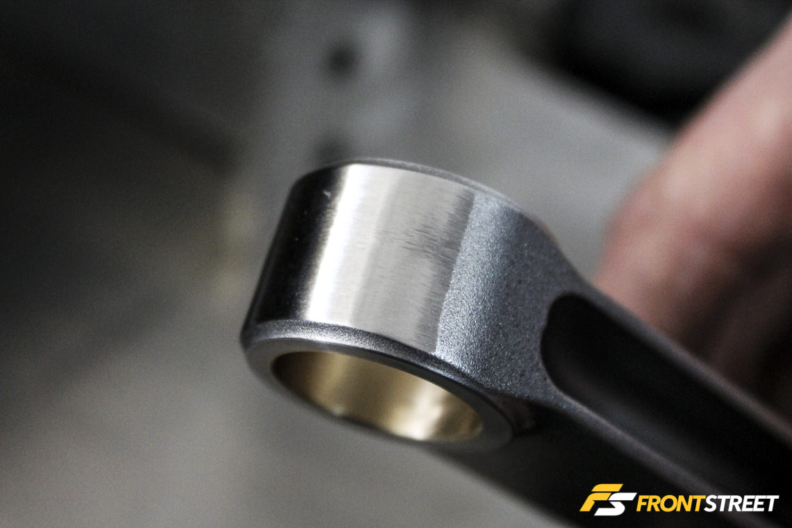 This sets the engine up with a rod-to-stroke ratio of 1.66:1 compared to the stock 1.58:1 ratio. Comparing both Nissan and Honda rods reveals both the big end and small ends are identical in size. The only difference was the rod width which was easily addressed through machining the big ends of the rods to clear the SR20DET crankshaft journals. This gives the engine a better rod ratio without having to shelling out large amounts of cash for a custom set of connecting rods.