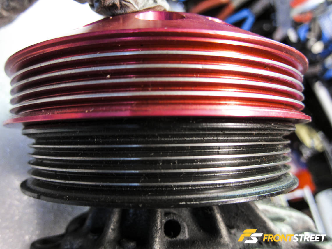 A new OEM factory water pump was installed in conjunction with an Oka-chan Super Water Pump Pulley from Yashio Factory. The lightweight, anodized (yes, I know it’s pink!) aluminum construction is 10 percent larger than OEM and designed to reduce rotational mass, which helps to increase the life of the water pump and improve cooling efficiency. SR engines are notorious for suffering overheating issues at higher rpms; this is caused by the stock water pump pulley’s rotational speed, which causes water pump cavitation and air pockets in the cooling system. The new pump and pulley should remedy this situation.