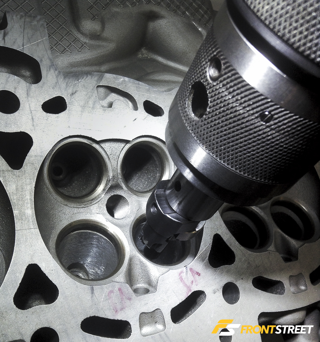 “We take the guides out and then port down into the head so we can work without the guide in the way, then install the new guides. You’re leaving some performance on the table by leaving them in during the porting process,” he explains.