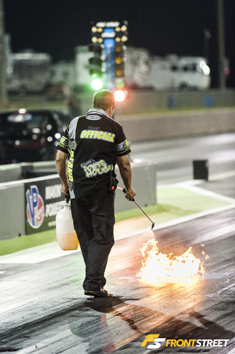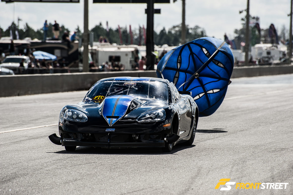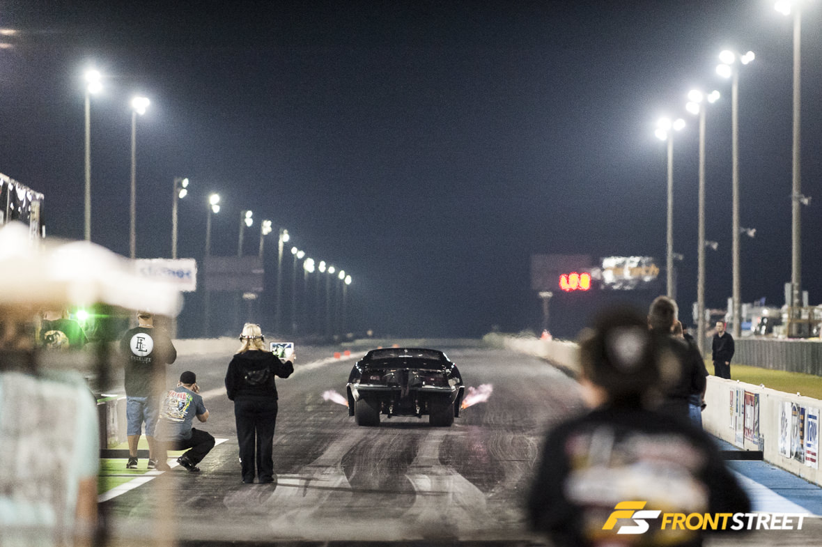 There were a pair of first-time finalists in the big-dog Radial Vs. The World class – one of whom was Missouri’s own Mark Woodruff, whom you might remember from our feature on his car. Woody entered the weekend with huge hopes for his Corvette, especially after qualifying was complete and he had recorded the highest-ever trap speed for a radial tire-equipped car of any type, covering the distance at a speed of 212.69 mph. During eliminations, drama ensued for Woody, as he knocked a piston out in the semifinal matchup against Steve Jackson. The entire RvW field was in his pit area helping the team to change out the offended parts, and opponent Joe Albrecht waited for Woody’s team to get the car back into shape. With a 10PM Sunday night curfew fast approaching, Woody made the lane call with about ten minutes to spare. When the tree dropped, Albrecht took the starting line advantage and never looked back, crossing the stripe in 3.837 seconds to Woodruff’s 4.005 – earning the $50,000 payday from the Duck.