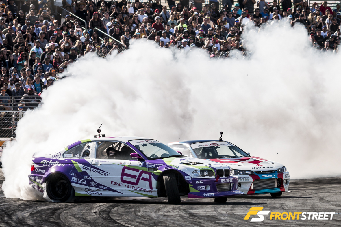 Michael Essa and his Achilles Tire/Essa Autosport E46 M3 faced off with Daijiro Yoshihara in the Rocket Bunny-widened Turn 14 Distribution Subaru BRZ. Yoshihara’s technical difficulties from his first qualifying run the day before resurfaced in the opening run of this battle, as he straightened out and stopped mid-drift amidst massive smoke plumes. This misstep heavily weighed into the judges’ ruling toward Essa going into the second run, and Yoshihara needed Essa to make a mistake for any chance of advancement. Unfortunately for Dai, Essa stuck to his bumper and progressed to the next round.