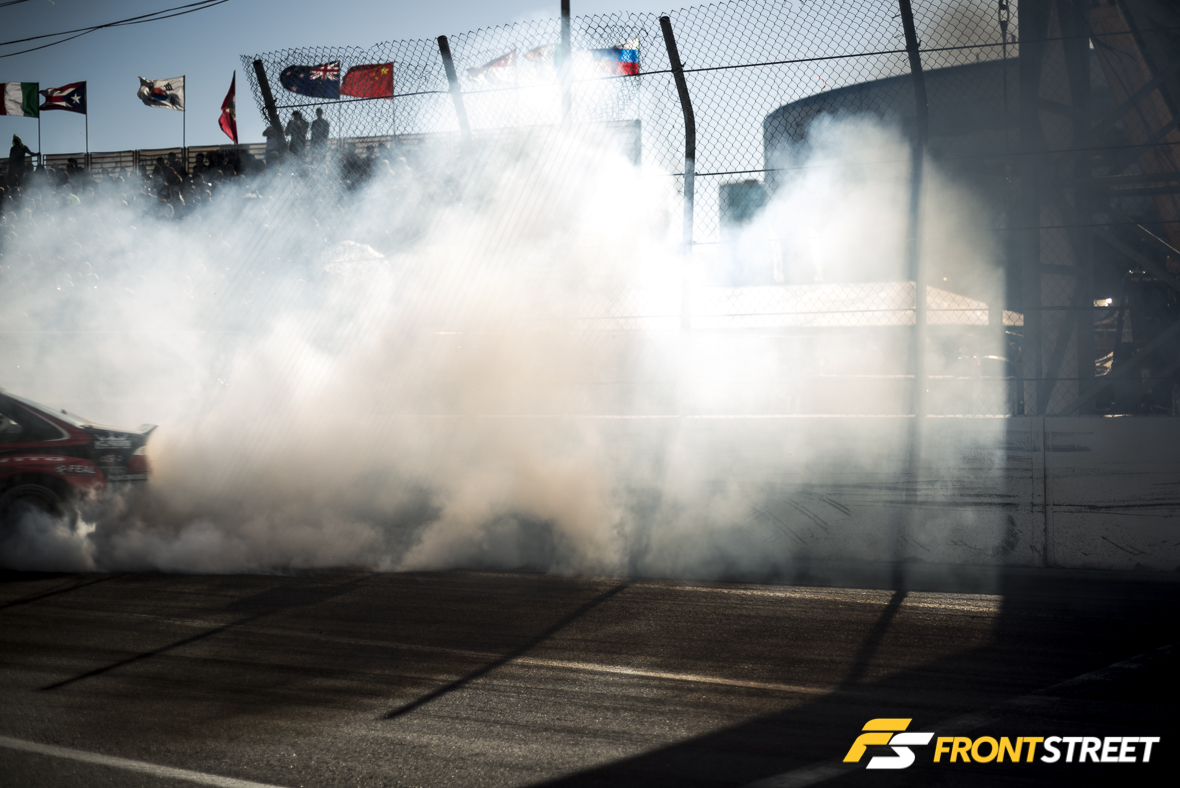 The Toyota Racing duo of Ken Gushi and Frederic Aasbø traded tiresmoke with one another in an asthma-inducing display of horsepower, which excited the crowd and readied the atmosphere for the upcoming tire-shredding slated to run deep into the afternoon.