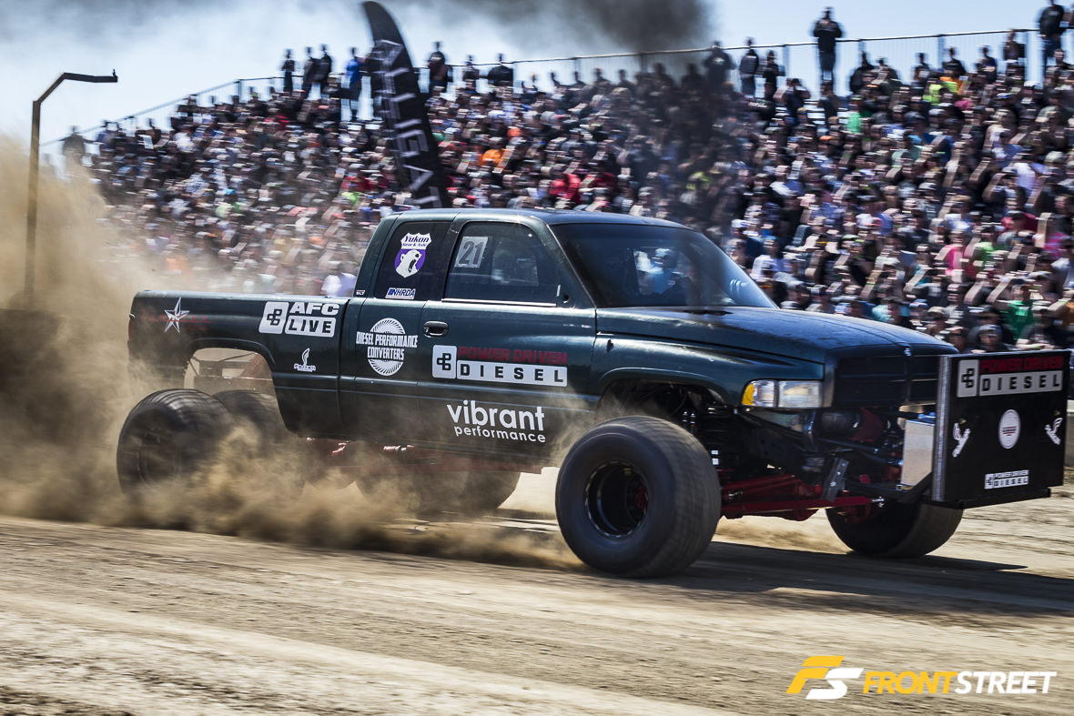 Much like 2016, Lavon Miller dominated the competition on the dragstrip with his Firepunk Diesel entry, carding a best pass of 8.63 to take the overall lead after that portion of the competition. They had tested on the previous day and run solidly in the 8s, then went to swap out the transmission for a new one. The truck wouldn’t go into gear, so they swapped it back to the known-good unit – even though it wasn’t fresh – and then had the same problem. Eventually, it was discovered that the transmission linkage wasn’t adjusted properly, so at that point they just left the backup in the truck and got to work on the strip.
