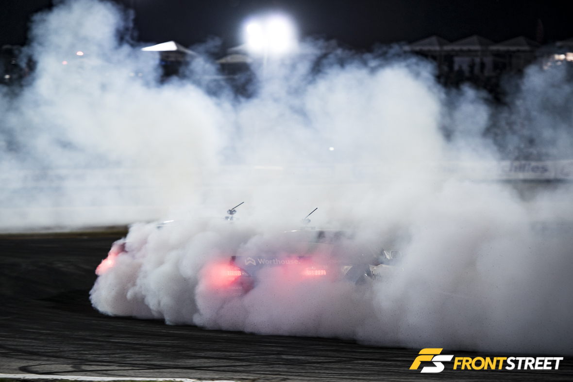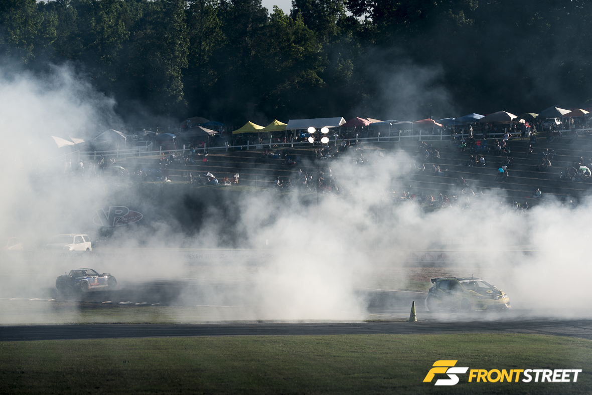 The pair returned to the keyhole turn and demonstrated their ability to shred tires together in a massive display of donuts creating so much tiresmoke that both drivers didn’t know where or how to stop and their cars eventually just found their way onto the grass where there was visibility. The clock had struck midnight and the two drivers patiently awaited the ruling together in front of the spectators left in the stands.