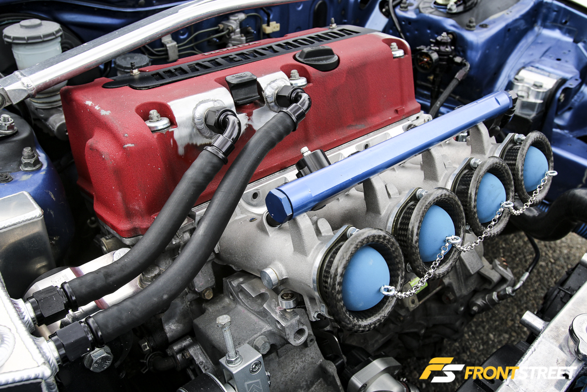 The interior was completely redone in suede and the dash was smoothed out to give the car a retro look. Integrated into the dash is the Motec keypad, which controls the entire vehicle’s electronics ranging from the fuel pump to the AiM dash display. A K-tuned shifter originally from an RSX was reworked to fit properly and work perfectly with the transmission. The rear seats were eliminated to retrofit a trick fuel system which uses dual AEM fuel pumps and a Nuke Performance surge tank. The customized front fenders allow fitment of wide 17×9.5-inch front Volk CE28 wheels with beefy Falken Azenis 275/40-18 inch tires.