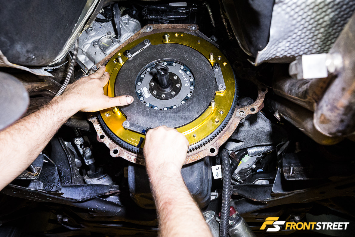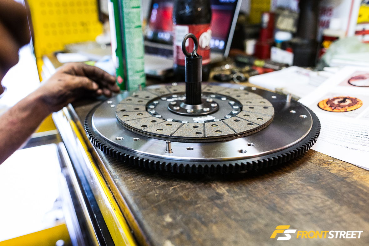 McLeod provides explicit directions on how to set up the clutch properly. We ran through the process on the bench just to ensure all of the parts and pieces lined up, the fasteners torqued properly, and there were no issues. Dowel pins are installed into the flywheel, the bottom disc is laid into the flywheel, and finally the adapter ring and floater/top disc/pressure plate are placed on top.