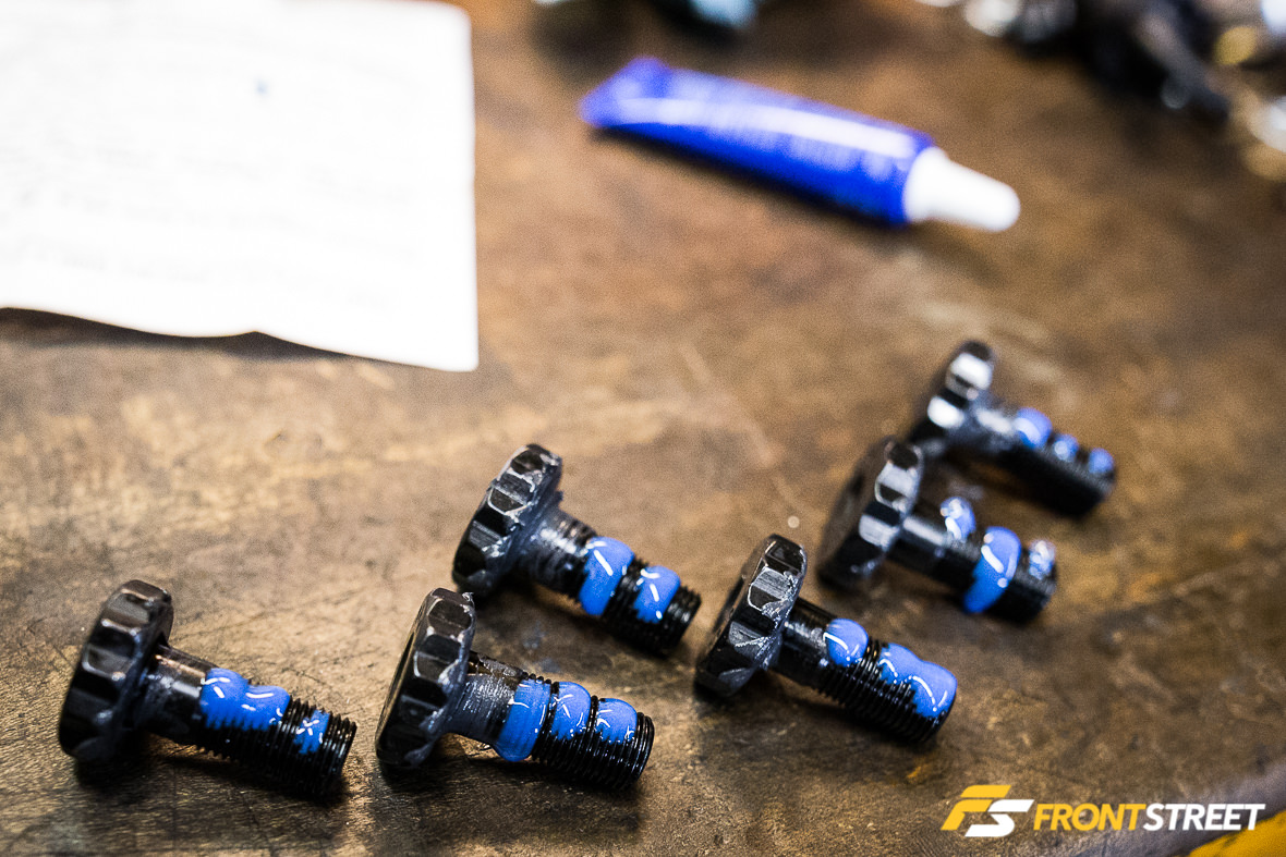 Installing the flywheel to the crankshaft. ARP specifies that all fasteners must have the supplied Ultra Torque lubricant applied to the underside of the bolt heads, and Loctite #243 medium-strength threadlocker applied to the threads. Set the torque wrench to 70 ft-lb and use a star pattern until the fasteners are secure.