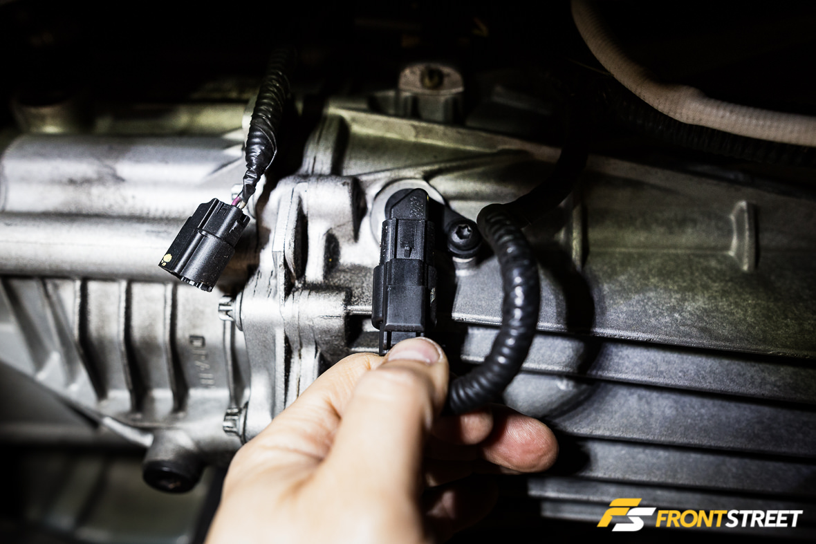 The factory k-member brace needs to be removed for access; four 15mm nuts and this is pulled right out of the way. There are a number of electronic plugs on the transmission for items like the speed sensor and oxygen sensor connections which need to be disconnected for transmission removal.