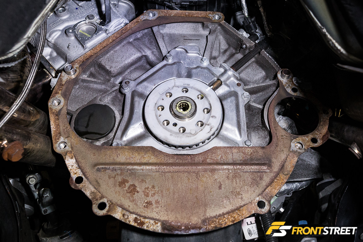 With all of the fasteners removed, the hydraulic line disconnected, and the shifter linkage freed up, Abbott pulled the transmission out of the car rather easily. Removing the stock clutch revealed the reluctor wheel on the back of the crankshaft. Many people have previously mentioned having to do a crankshaft relearn using a handheld programmer. I must have gotten lucky, because once we buttoned everything back up, I’ve driven the car approximately 800 miles so far with no issues or codes thrown.