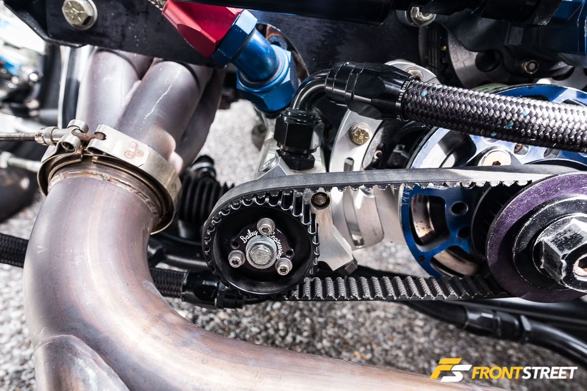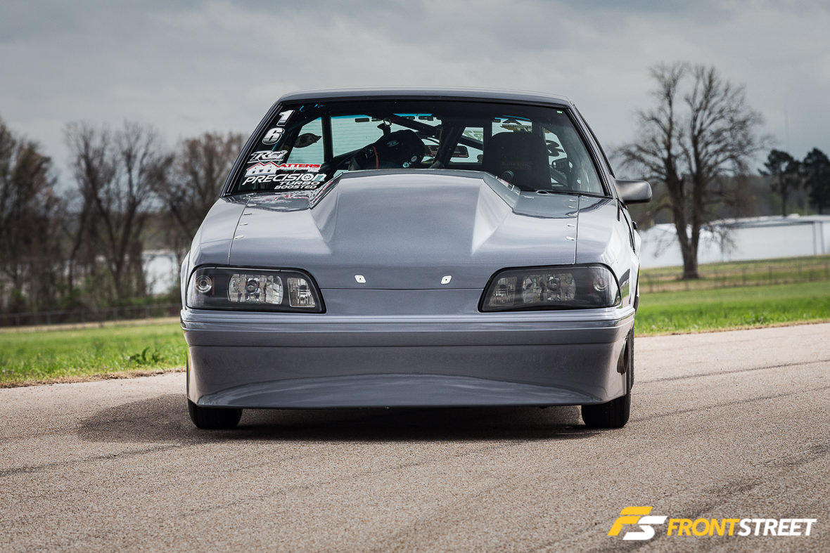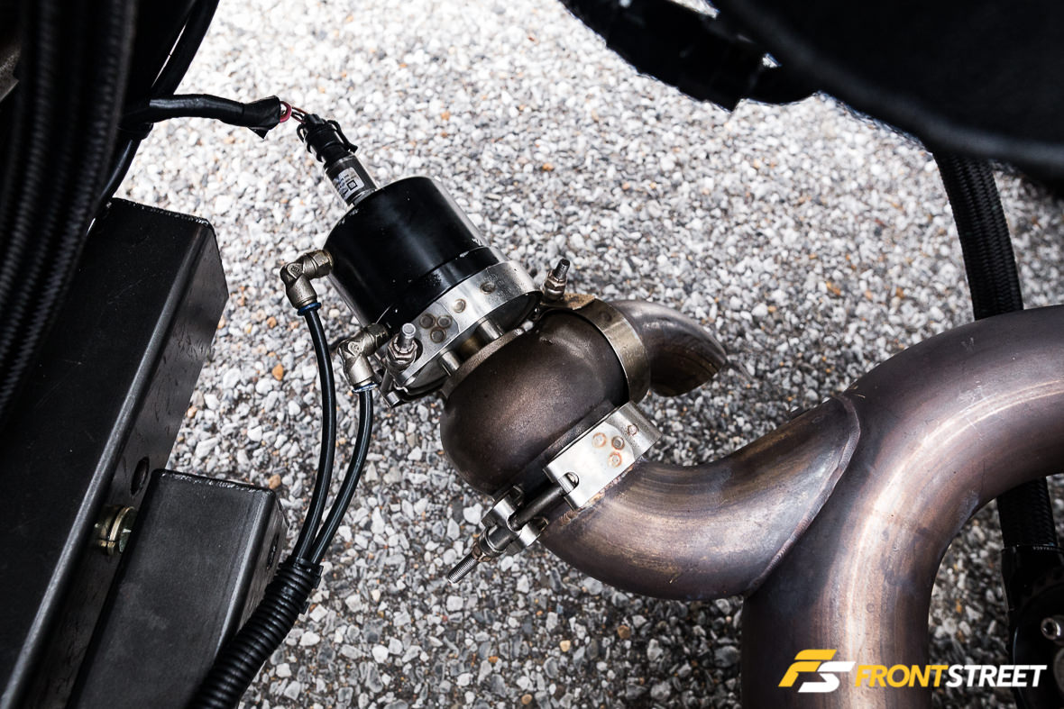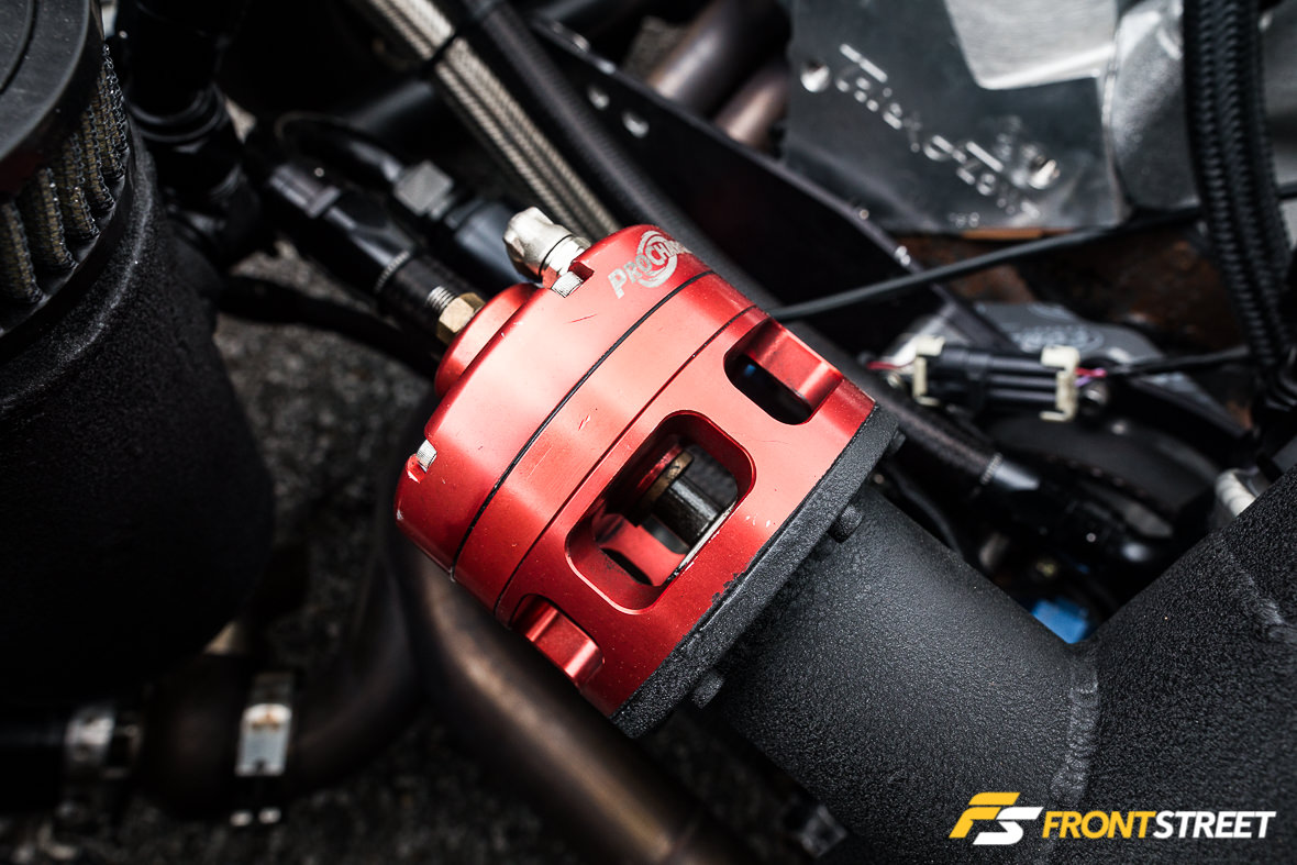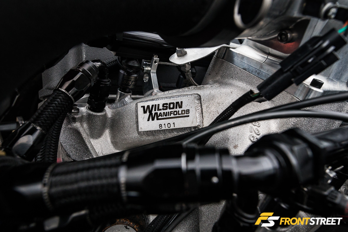 The Ultra Street class rules limit the engine components used; Eichhorn selected a set of Trick Flow High Port cylinder heads and a custom intake manifold from Wilson Manifolds to top off the short-block and manage airflow expectations. These are fed by one of Precision Turbo’s 76 mm cast-wheel turbochargers, fed by a TIG Vision-crafted turbo system.