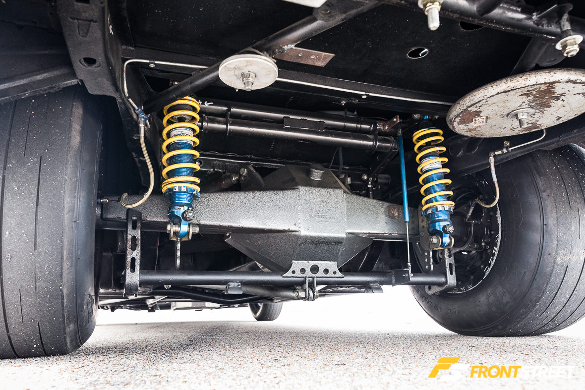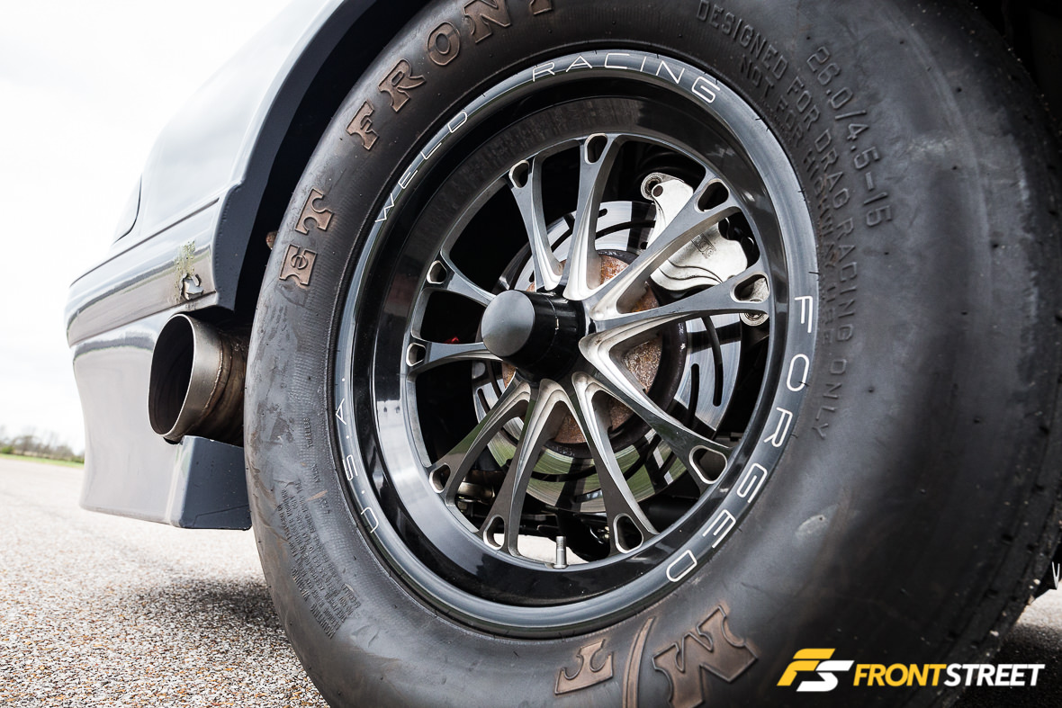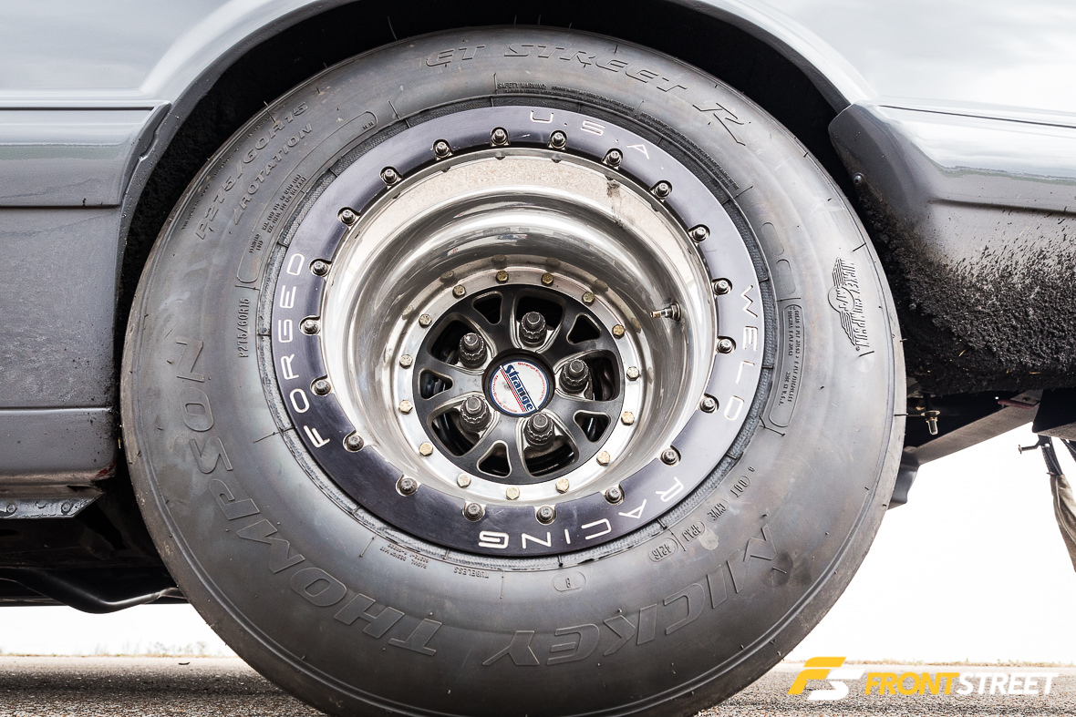 The chassis has been set up with a stock-style front suspension system featuring components from Racecraft, Inc.; the company’s tubular control arms and k-member combine with lightweight drop spindles and steering system to sharpen steering performance while reducing weight to the absolute minimum. Menscer Motorsports-modified Afco Racing double-adjustable front struts and Afco springs are up front, with Menscer/Afco double-adjustable rear shocks also in play. The dampers have been valved to help Alm get down the track on the small 275/60/15 Mickey Thompson ET Street R tires he runs in the Ultra Street class. Strange four-piston brakes are hidden behind Weld Racing V Series 15×3-inch front and 15×12-inch rear wheels at the corners.