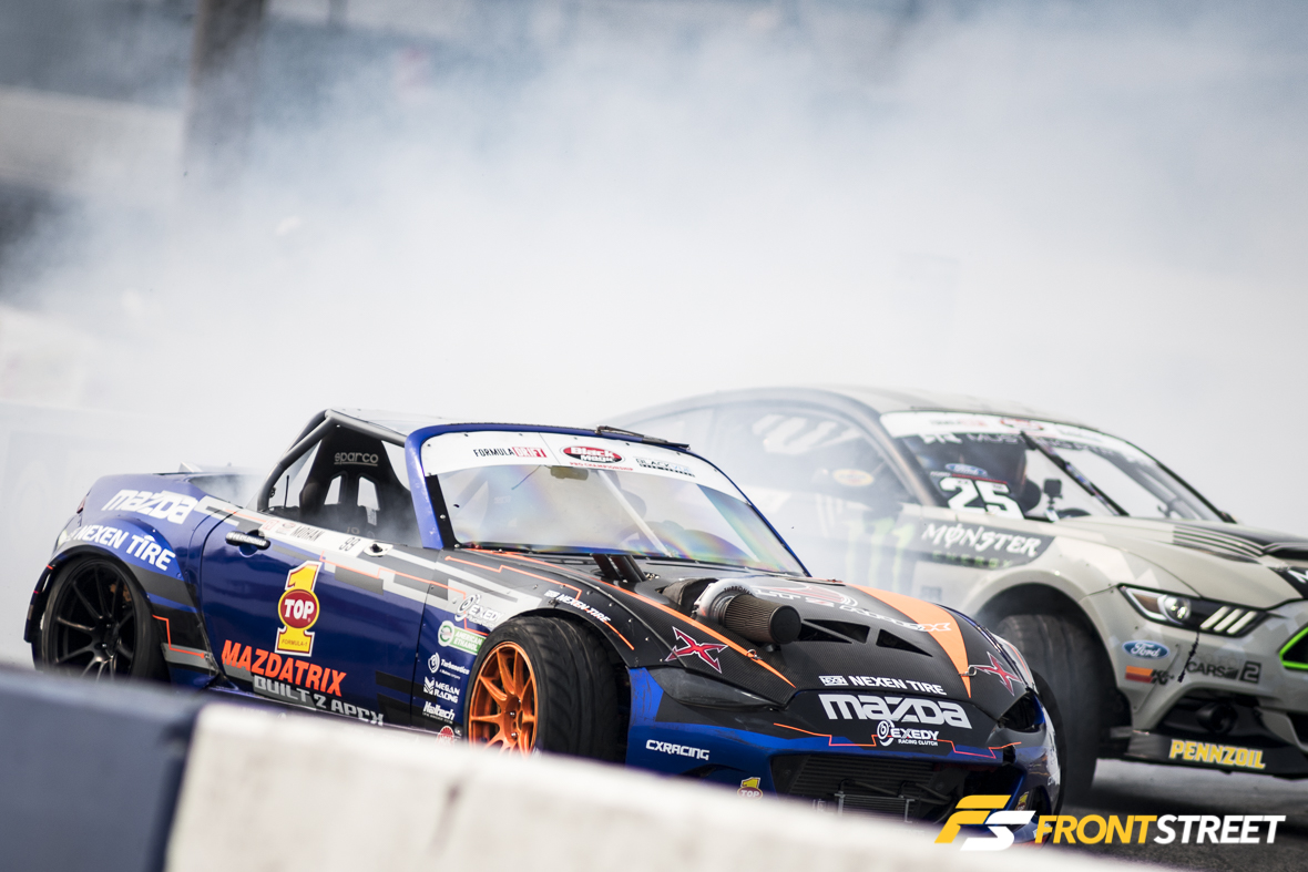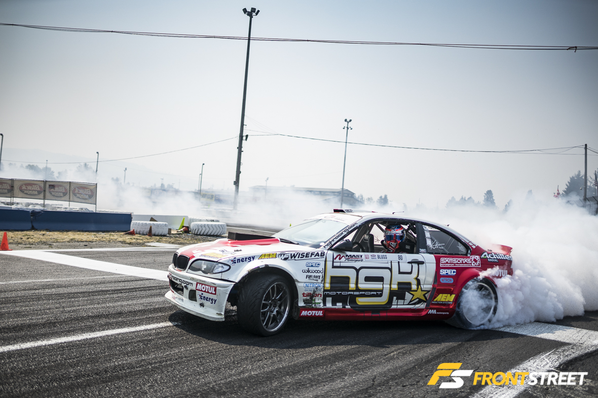 Former Formula Drift champion Chris Forsberg in the NOS Energy Drink Nismo 370Z didn’t let a little fire get in his way of qualifying within the top ten. While other former champions like Dai Yoshihara weren’t that lucky, as Yoshihara struggled to get his Turn 14 Distribution Subaru BRZ feeling solid enough to earn a place higher than 20th ahead of Saturday.