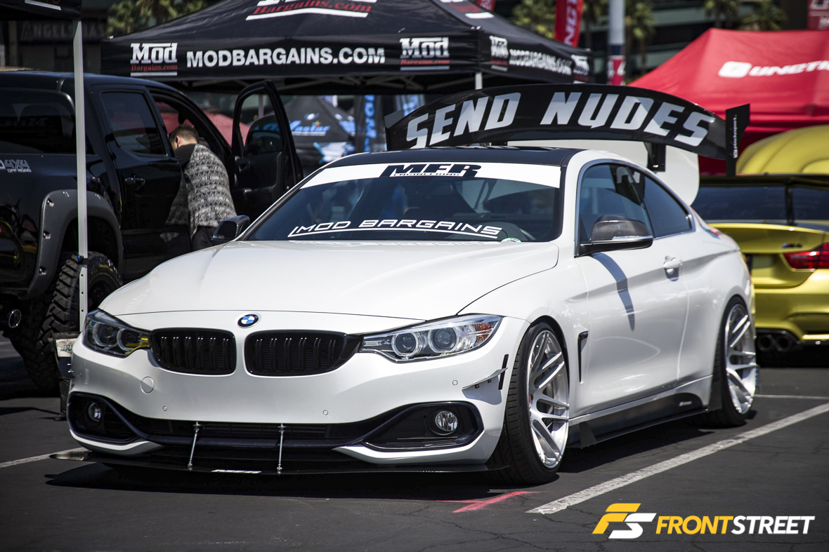 The Feal Suspension booth housed one of our personal favorite cars of the day. It was a sleek black painted S13-chassis 240SX coupe with a front-end taken from an S14-chassis. This car was a showstopper, built with everything from looks to horsepower to craftsmanship. The roll cage, which even cradled the 2JZ-engine in the bay, was painted a contrasting white hue with dimple-die gusset plates throughout the interior and engine cage. The waste gate dump tubes pointed out of the hood with holes at the end to mimic muzzle brakes commonly found on rifles. Wisefab knuckles were chosen to add more steering angle to the car.