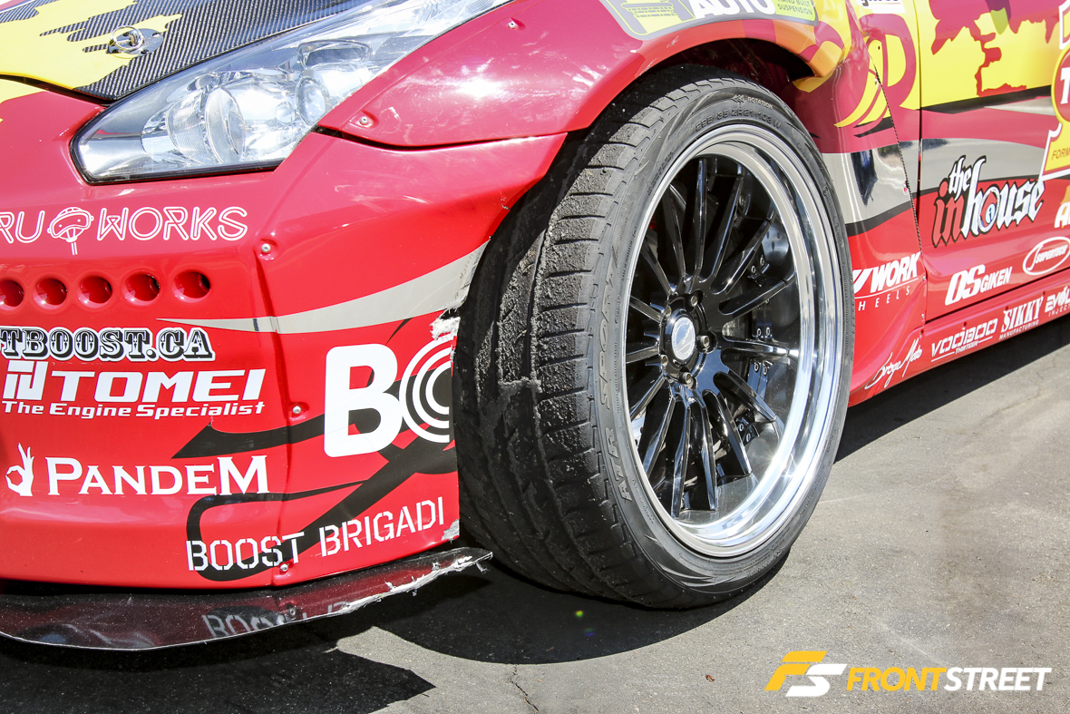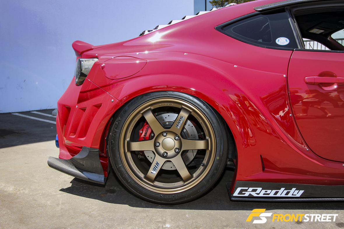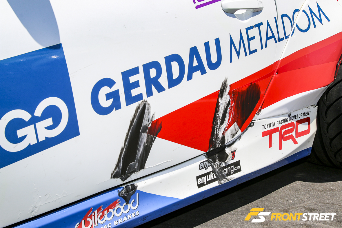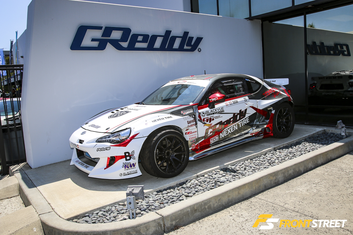 Sitting just behind the blue machine was the original GReddy drift car that Ken Gushi competed during the 2015 FD season with a turbocharged-EJ25 power plant. The Scion FR-S was eventually retired from competition but not before it received a 2JZ power plant. It now serves as a demo car for Toyota and is used primarily for ride and drive at various events and track locations.