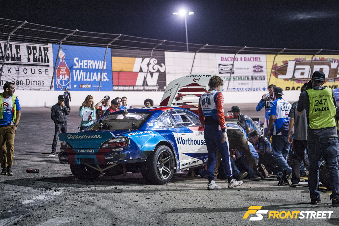 The only mishap in Top 8 competition came at the hand of Odi Bakchis, when he ran into the back of Deane’s Worthouse S15 Silvia during their first run. This wouldn’t normally be an issue, but in keeping with what seemed to be the theme of the night, that wasn’t the case. Both cars would be towed off the course with suspension damage. Since Odi was deemed to be at fault, Deane and his team were given 10 minutes to try to fix the car. He then was forced to use a competition timeout when he couldn’t make it back to the line in time, and when that expired the round was called in his favor without the two men having to drive their second bout.