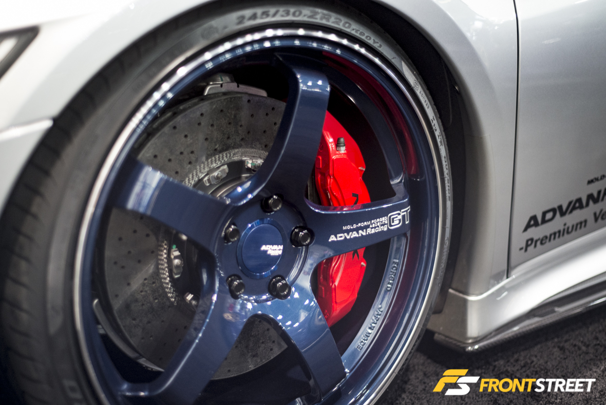 In the Mackin Industries booth space—specifically RAYS wheels— was an extravagant Toyota 86 clad in the coveted Varis Kamikaze-86 kit. This elaborate dressing, rich in carbon fiber, covered nearly every panel of the car, to transform the basic looking sports coupe into a track day menace. The original design of the kit can be viewed in our Tokyo Auto Salon coverage from last year, but its hood incorporates ducting designed to release hot air from the radiator/intercooler directly into the atmosphere. Due to an array of conflicting modifications, the ductwork needed to be trimmed and removed from this particular example’s hood, although the ducts still function by unleashing unwanted heat from the Blitz turbocharger kit. The car also rides on a bespoke setup of RAYS/Moton collaborative dampers made specifically for this vehicle.