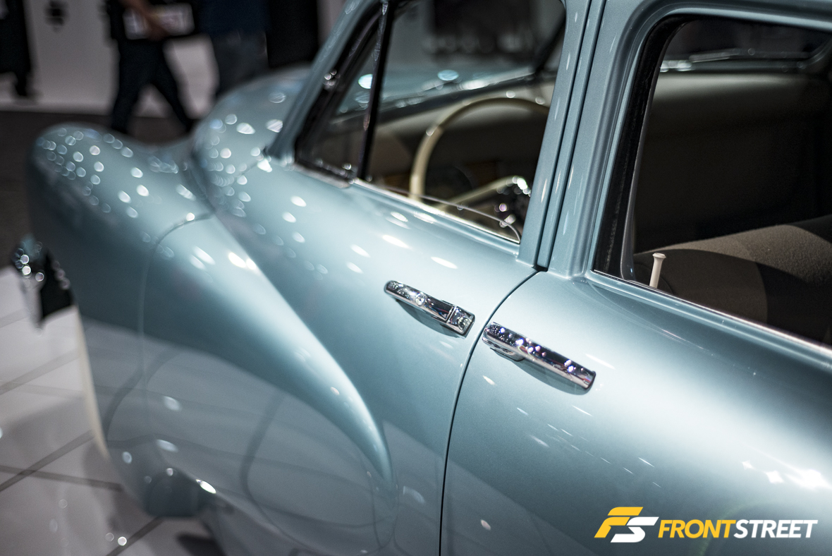 Our friend Rob Ida has done it again! (We’re considered friends right, Rob?) If you recall our features of his past two SEMA debuts —the Porsche 930 Turbo, and Mercury Custom—you’ll remember that he has a definitive style, in that everything he touches seems to morph into a perfect blend of highly customized yet understated splendor. His execution no different this year, he took a commonly forgotten automobile manufacturer, and renovated it into a masterpiece that attracted a crowd all week long. In the Axalta booth was his Tucker Twin Turbo, perfectly enveloped in a fitting aqua metallic paint color. In an effort to both complement and contrast the lighter shade of paint, Ida and his team fitted conflicting style wheels onto different sides of the car. The driver’s side was equipped with period-correct elegant white wall tires accompanied by chrome hubcaps, while the passenger’s side donned a more modern, aggressive pair of gunmetal billet wheels with smaller tires. Which looked better is yet to be determined. We’re just hoping we can get our hands on this latest creation for another feature, so we can explore the details in-depth and showcase another standout from the New Jersey native.