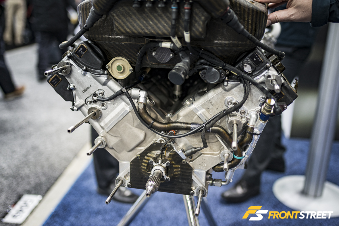 The Cosworth booth was all business, showcasing some of their older upper-echelon developments, alongside some of their newest road-going advances. The first thing I noticed was their CR-2 Formula 1 power plant. This naturally aspirated 3.0-liter, 72-degree V10 was used in the Jaguar Racing Formula 1 teams during the 2000-2004 seasons, before the team was sold to Red Bull Racing for the 2005 season.