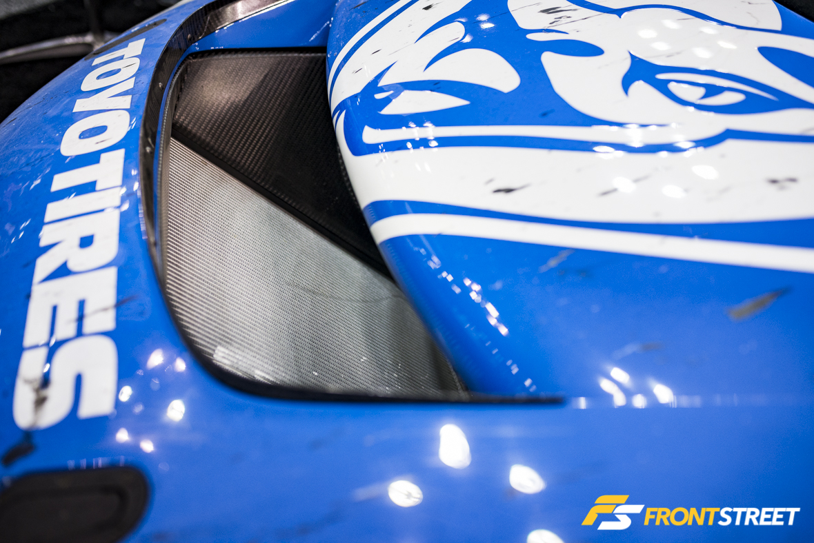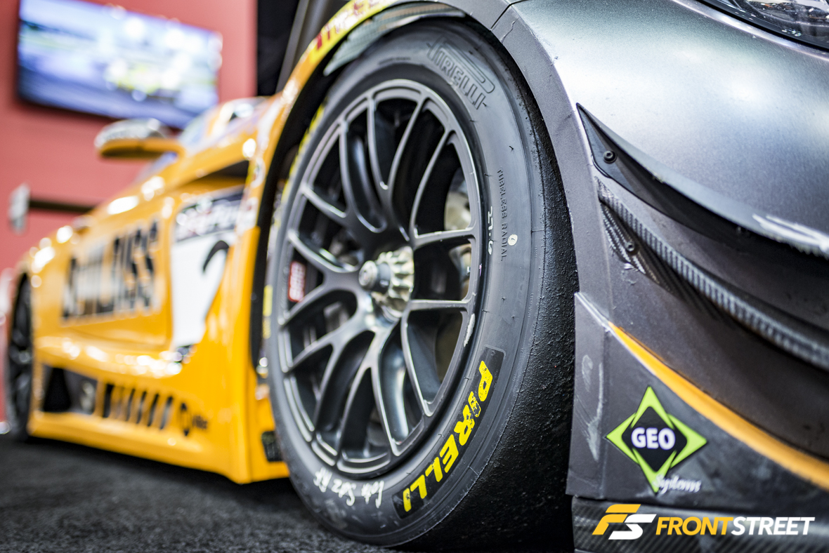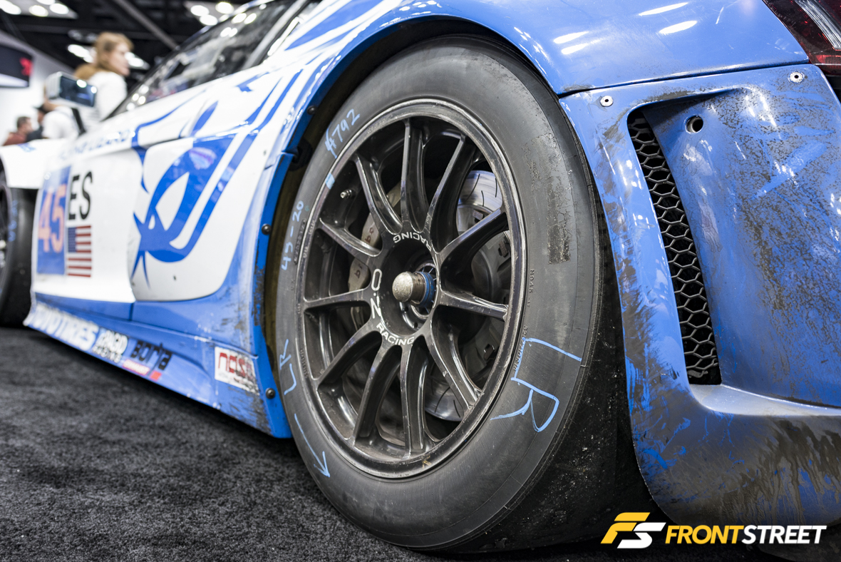 Fresh from yet another victory at the 25 Hours of Thunderhill race, the Toyo Tires booth again housed the class (and overall) winning No. 45 Audi R8 LMS from Flying Lizard. Clad in its usual guise of dirt, rubber, and bruises from the hard-fought endurance race, this car shows what this event is all about. The crossroads where innovation meets hardship and perseverance to take home the coveted victory.