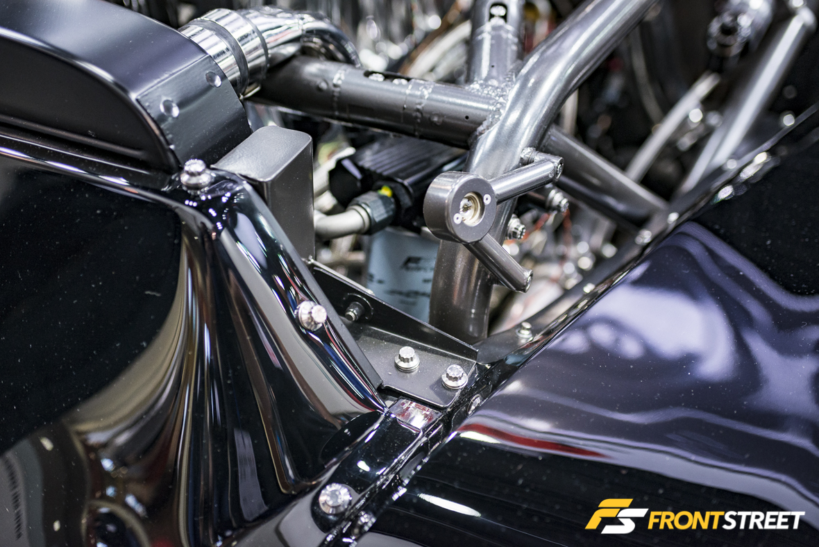 Putting these parts into action, Jason Schmuck’s twin-Garrett-turbocharged, J-series engine swapped Honda S2000 was on display for all to see. The engine bay of the dragster was riddled with gleaming pie-cut titanium tubing and two Vibrant Ti mufflers. To top it all off, the artistic exhaust was enhanced with some specially heated sections, which naturally changes the titanium’s color to a rich bluish-purple hue.