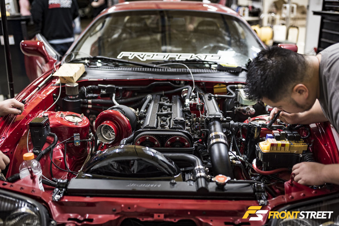 Inside one corner of the shop Jimmy Nguyen and Jon Do looked over some wiring issues (#2JZworldproblems).