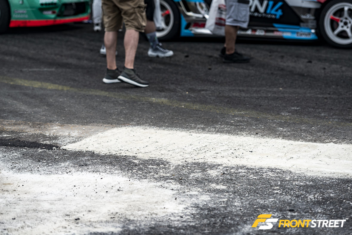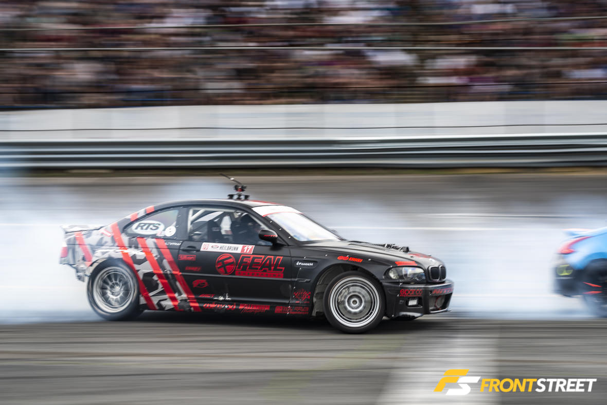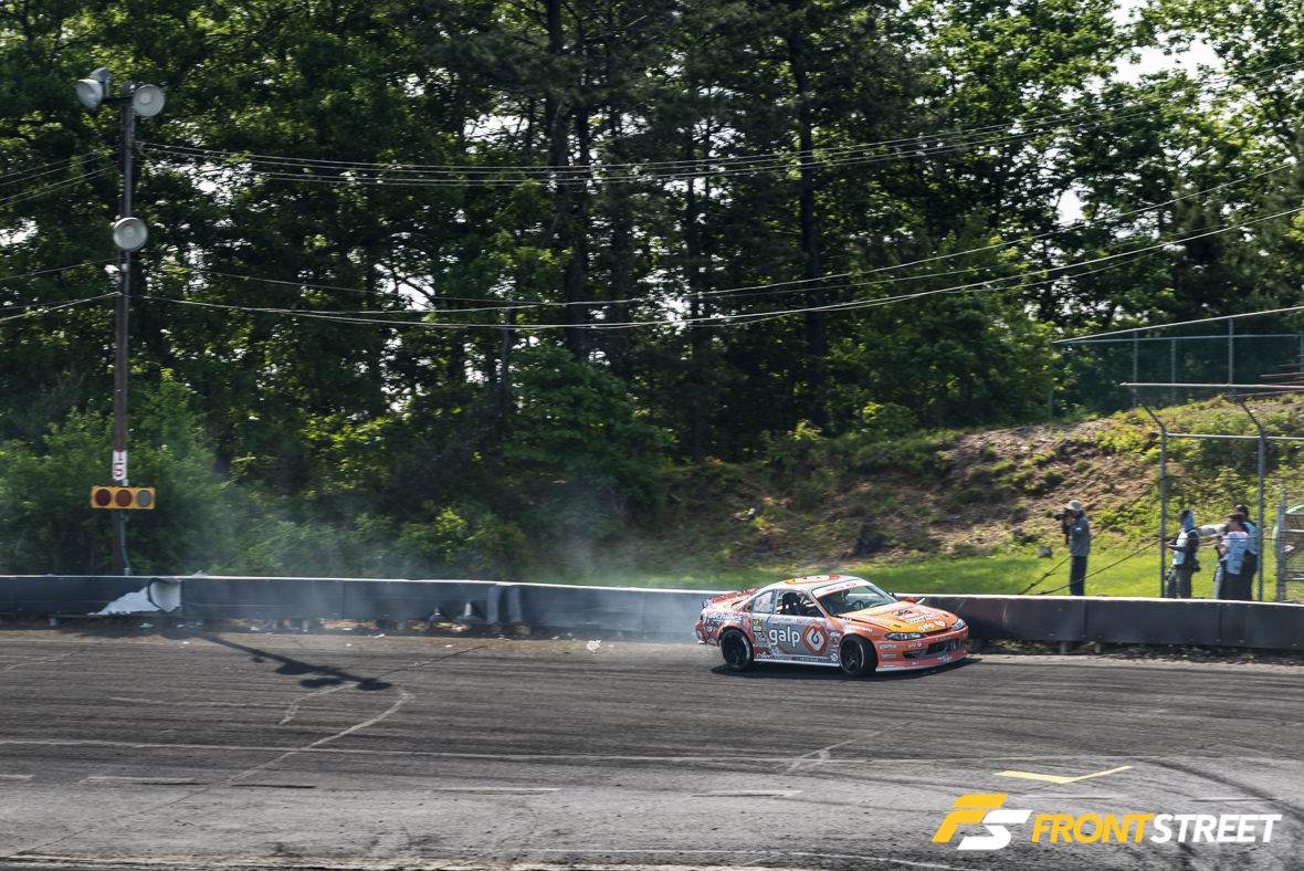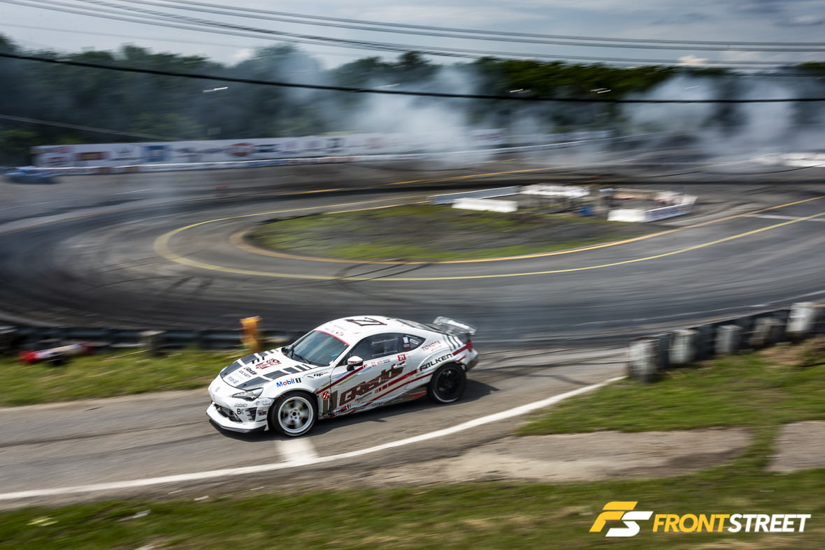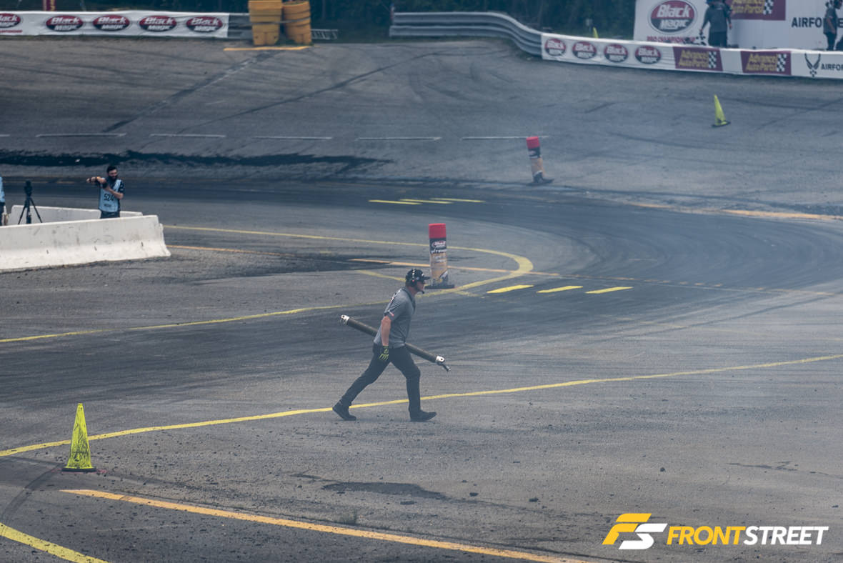 Practice got underway with drivers still weary about the potential weather, pushing their cars to the limits of the track. New for this year, the Formula Drift staff had affixed black plastic paneling to the sharp guardrail in an effort to promote a sliding effect on the wall, rather than the infamous grasping of competitors’ cars this track is known for. The issue came when the cars abused the paneling. The plastic took quite a long time to replace, which slowed down the practice sessions early in the day. Because of this it was removed prior to Saturday’s festivities.