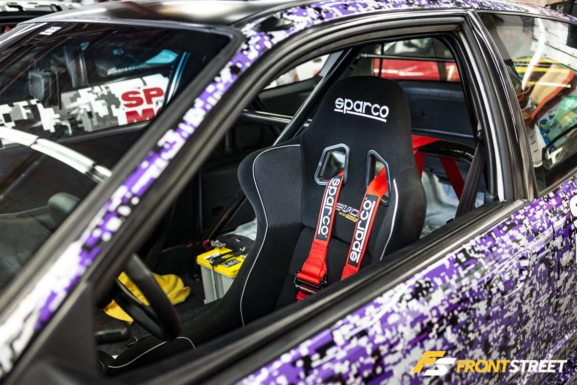 Tiffany Miller, or @daaamngiina, also provides additional help to the shop. Her current stable includes a Voltex-equipped AP2 S2000, and the Rallye Red Civic Type R parked out front. New to Miller’s and SCM’s lineup for 2018 is the “#purplepeopleeater” digital camouflage wrapped K24-swapped EG-chassis Civic, which she will be piloting in time attack events soon.