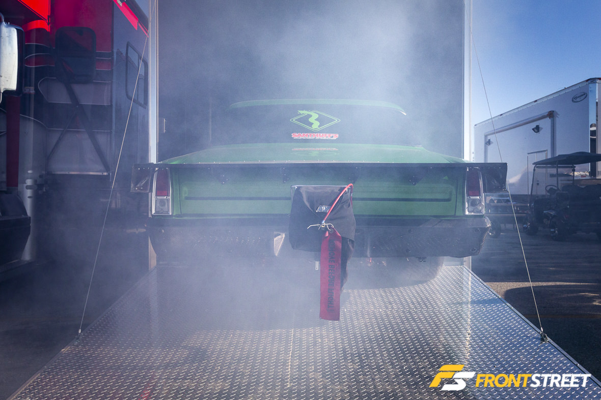 The ’66 Nova’s 25.2-spec chassis wears a Smith Racing bolt-on front end setup with struts, a grand departure from the Nova’s original suspension arrangement. And as a card-carrying member of Leaf Spring Nation, Milliken does the dance on what could be considered an antiquated rear suspension design, although it uses state-of-the-art Calvert Racing split mono-leafs and Smith Racing’s Assassin traction bars to suspend the McNasty 9-inch housing built by Tessneer. The housing is filled with a Strange Engineering Ultra Case third member and 40-spline axles, and when combined with the Menscer Motorsports rear shocks and Santhuff front struts, the car is configured to perform as consistently as today’s modern stock suspension cars. As the only car competing at this level with this engine combination, it’s been quite the ride so far.