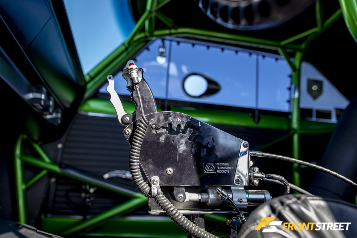 “Leaving on the transbrake with enough to get the turbo to go somewhere and a converter tight enough to make use of our super-short low RPM powerband means you have to get past the torque somehow. This usually means kicked tires and/or epic wheel stands. But we’ve managed to get really tricky with our converter setup, how we leave, how we apply nitrous, fuel quantity cuts as we get near our G meter peak, and converter dumps. Basically the first 60 to 80-feet of a pass is a near-perfectly-orchestrated song and dance. Once the g-meter noses over and the car settles out, we can turn on whatever we want and it’ll take it,” he shares.