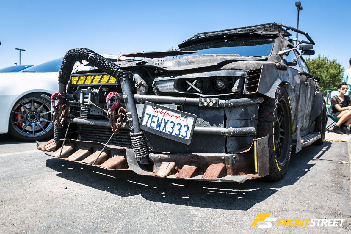 I’ve witnessed the progression of this Mad Max-styled Mitsubishi Lancer over the past few years. Typical of someone roaming the badlands in search of parts to fortify their vehicle for added protection and durability, new modifications include a snow-plow-style front lip, custom diamond-plate wide fenders, additional metal plating bolted onto the hood and new all-terrain tires.