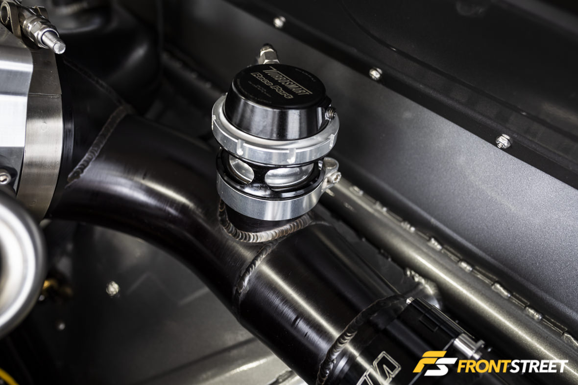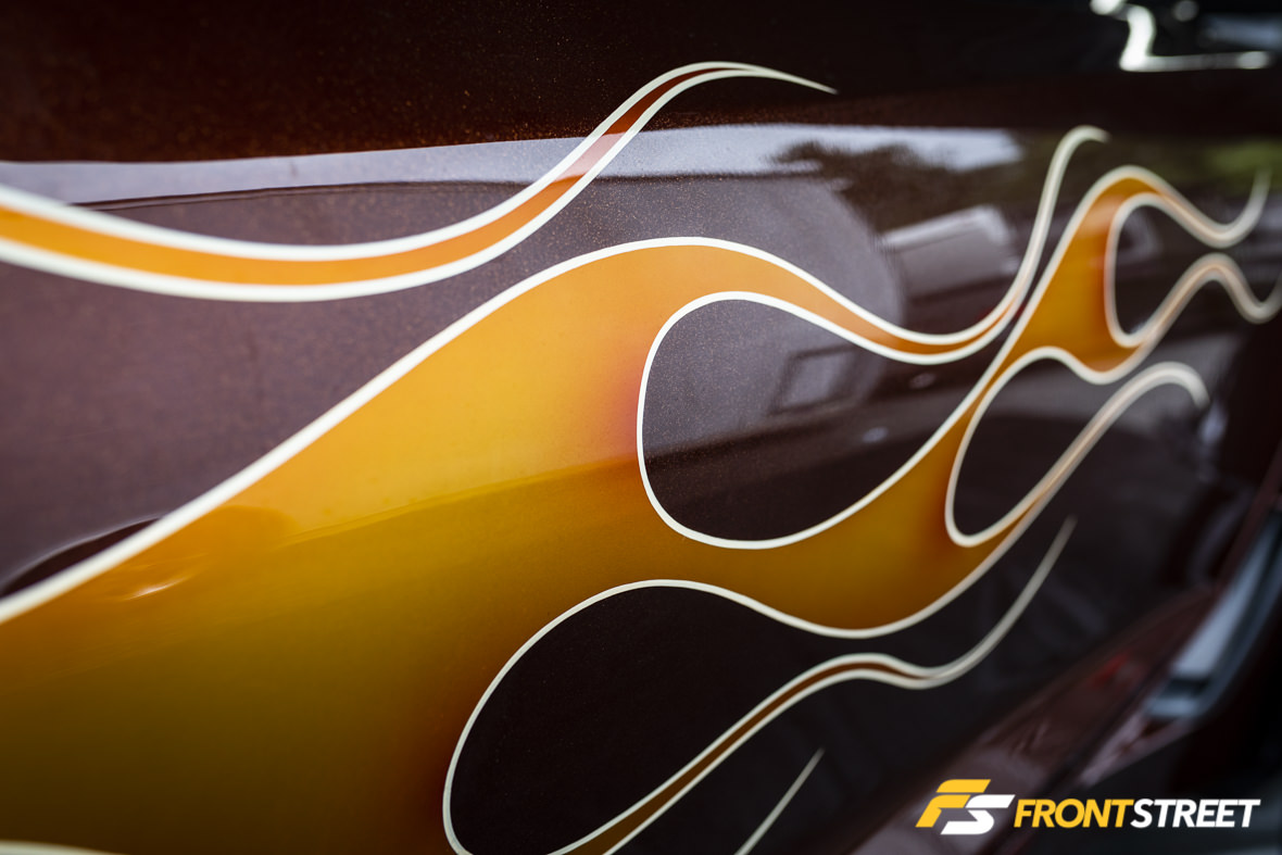 The stout 521 cubic-inch powerplant is fronted by a pair of 88mm Garrett turbochargers and runs the power through a Pro Torque converter and one of M&M Transmissions‘ two-speed Turbo 400 transmissions. A Mark Williams Enterprises rearend turns the power into forward motion, while the car rolls on a set of Weld Racing V-series wheels.
