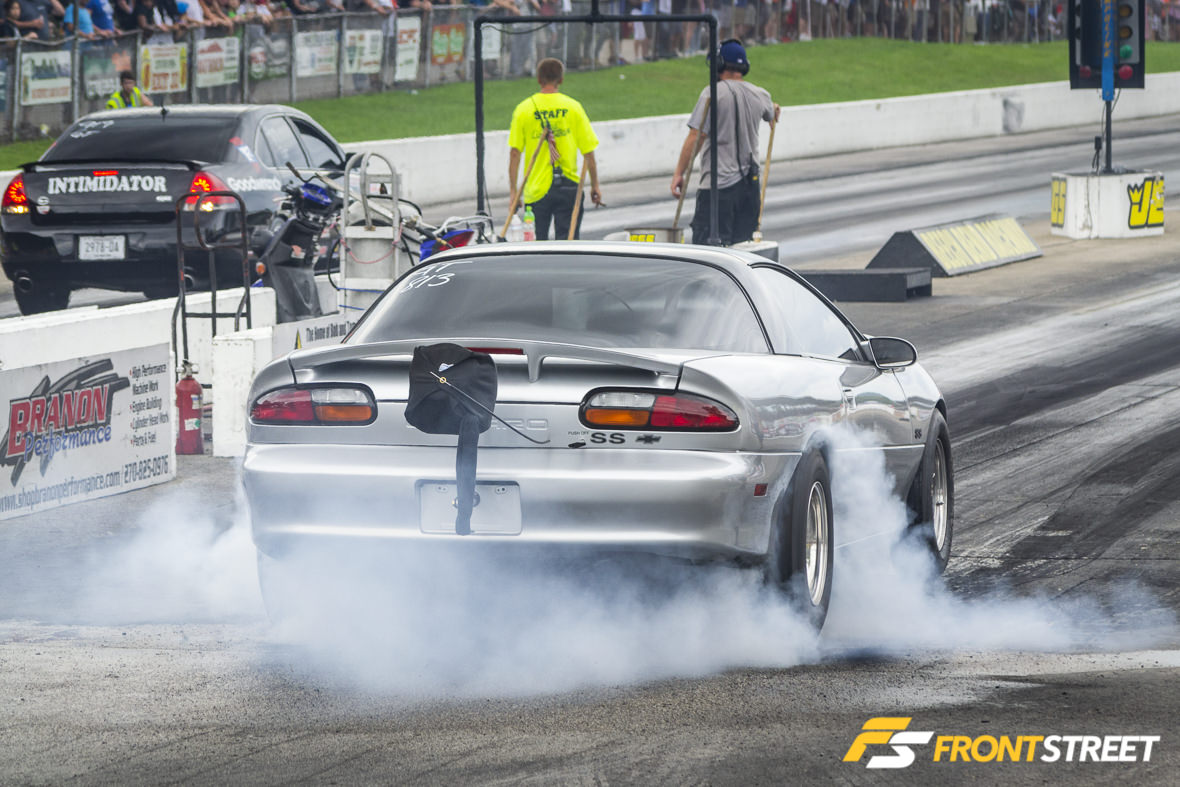 One of the most enjoyable classes to watch was the Stick Shift/Banger class, in which Garrett Mitchell (Cleetus McFarland), Jarred Cocanougher, and Ray Bulach all battled it out, ripping gears in hopes to light the boards with a 7-second pass! Bulach’s Texas Speed and Performance turbocharged Camaro was the first and only one to do that this weekend, running 7.98 at a blistering 185 MPH—this was also his first time in the 7s, and with an H-pattern shifter to boot.
