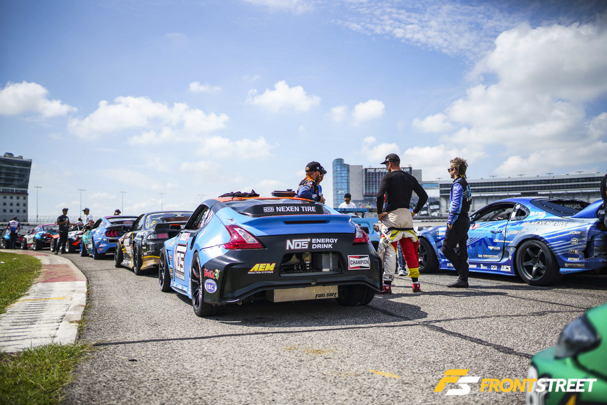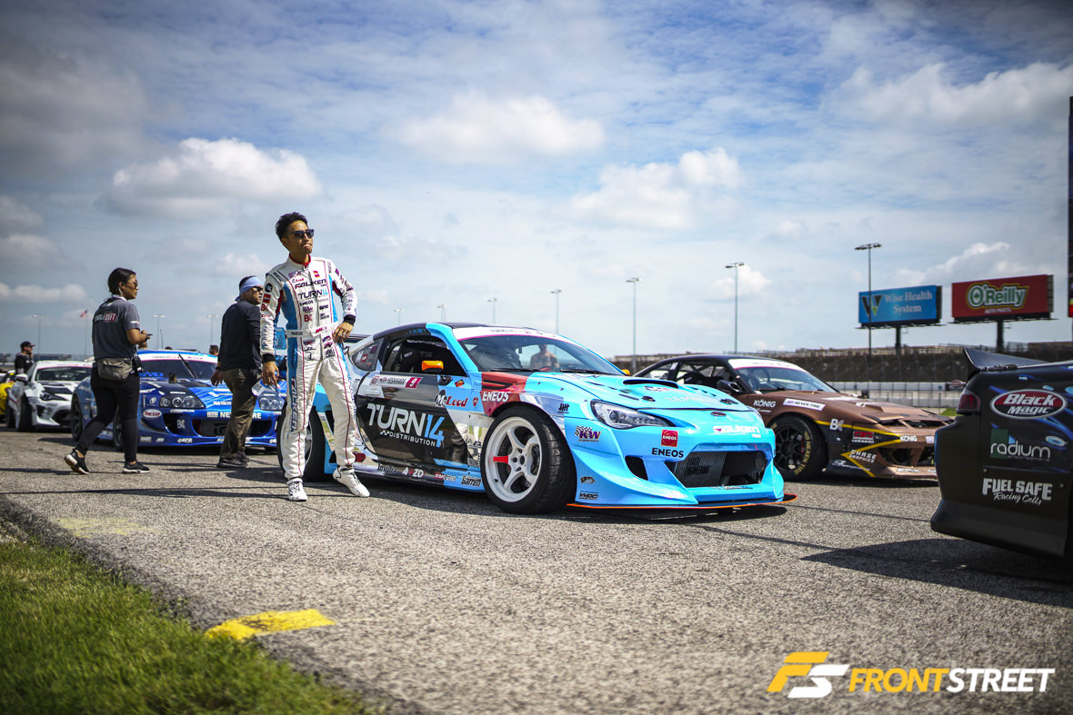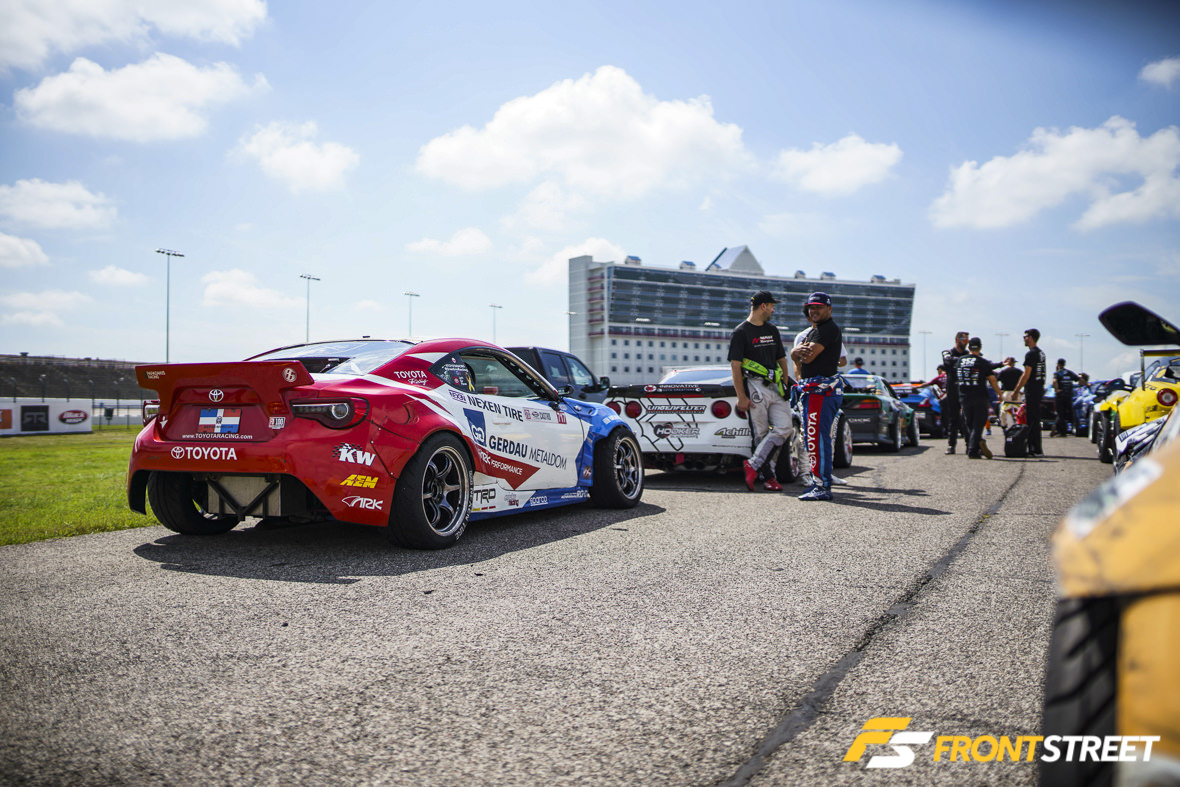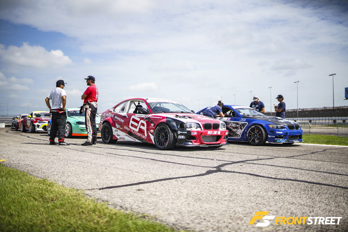 The saying “everything is bigger in Texas” proved true during Round 7 of the Formula Drift series, courtesy of some gargantuan rolling thunderstorms the likes of which I hadn’t seen outside of movies. While Formula Drift is no stranger to wild weather, this round provided a little bit of everything with spurts of heavy rain and lightning followed by clear skies and beating sun. Due in part to wet weather which occurred during the qualifying sessions, what should have been a Top 32 turned out to be a Top 30, meaning the top 2 qualifiers—James Deane and Alec Hohnadell—would be given bye runs and a free pass to the Top 16.