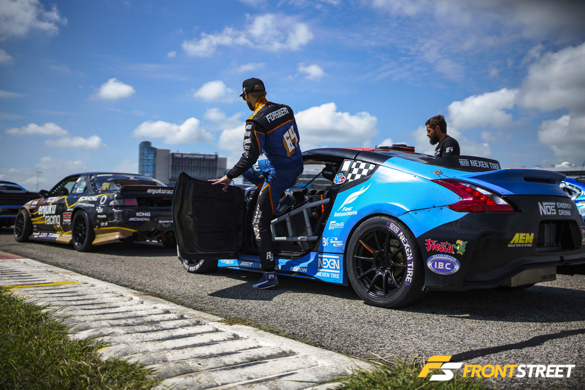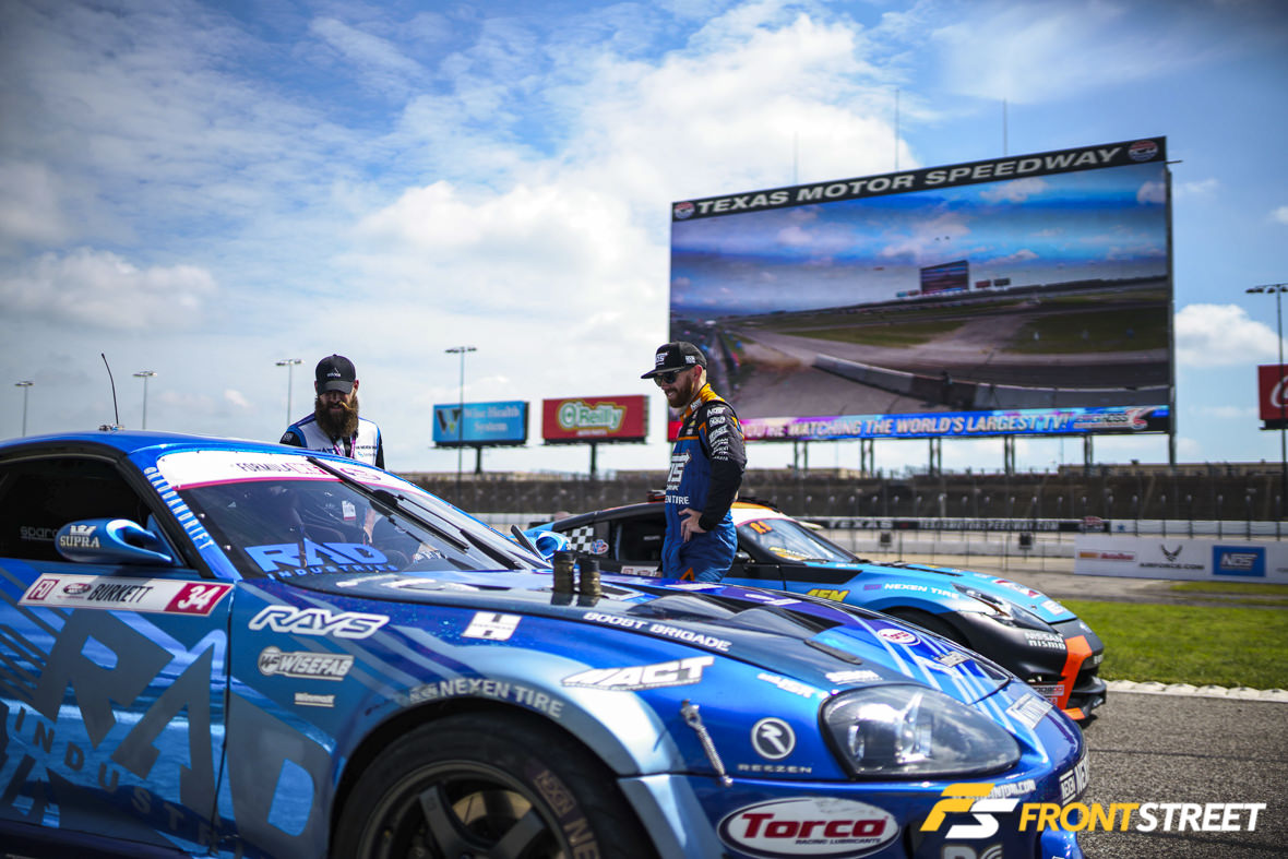 As the sun began its descent after a job well done, the competitors lined up for the opening ceremony and Top 16 was underway. Ken Gushi was not able to continue his quest to shake up the points as he was up against James Deane, and Deane’s consistently flawless driving advanced him to the Great 8. Texas Motor Speedway wasn’t the only thing with dark clouds hanging heavy overhead, as Chris Forsberg’s team was plagued with engine trouble before Top 32. Then, in his Top 16 battle with fellow champion Fredric Aasbø, Forsberg wasn’t able to keep his 370Z on track and was forced to concede to Aasbø, who advanced to the next round.