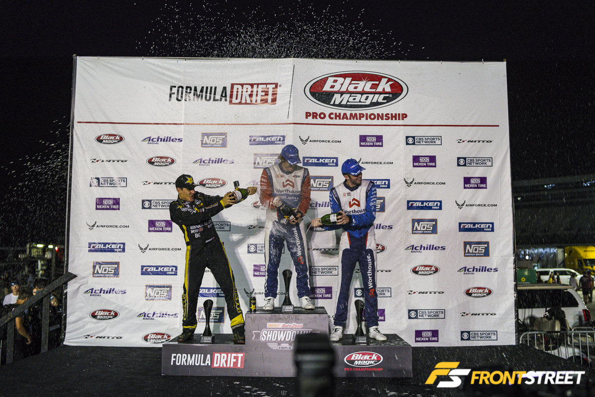 The Final Four Battle between Deane and Aasbø was up first, but this bout had much more on the line than just the opportunity to advance to the finals. This event is the second-to-last stop on the Formula Drift Schedule, and Deane was positioned atop the points standings with Aasbø nipping at his heels just a mere 30 points behind. The outcome of this battle had the potential to solidify the points lead for Deane, earning him back to back titles as Formula Drift Champion. When the smoke cleared, Deane’s effortless driving advanced him to the finals with congratulations from Aasbø for a battle well won.
