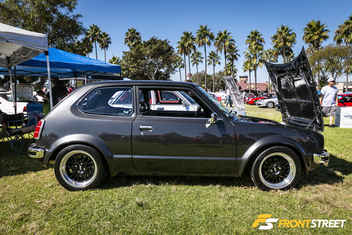 The stance was achieved using custom control arms, BC Racing coilovers and a set of 15×6-inch Work Meister wheels.