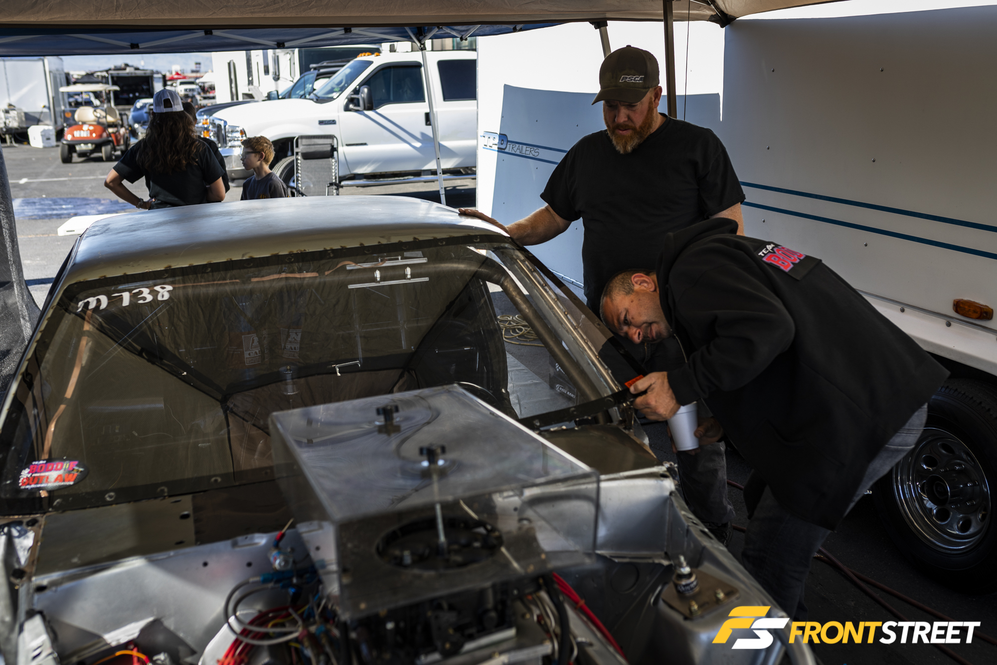 Meet the man with one of the loudest Pro Mods I’ve ever heard, anywhere. Mike Maggio’s blown ’68 Camaro is usually at the top of the field, but the team struggled all weekend long at SCSN this year. More than once I saw the supercharger off the top of the engine between rounds, and ultimately he was out of commission by the end of Saturday. Although most of the engine was destroyed and he had a spare in the trailer, the team elected to call it quits on the weekend as he felt there were other issues going on with the car that would prevent them from making competitive runs. With respect to the damage, he thinks the threads pulled out of one of the connecting rods, the capscrew fell out, and then all hell broke loose. Looking at the photos, we’d agree. It was ugly.