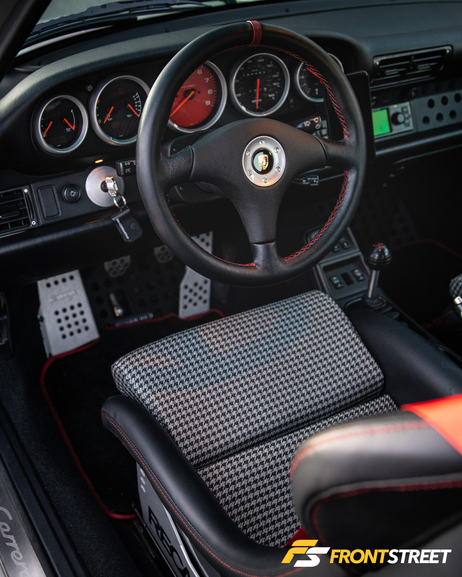 One of the most notable additions to his 993’s interior are the custom Recaro Pole Position seats with silver and black 911R Pepita inserts. I didn’t realize how special of a material Pepita was until I actually touched the fabric and was taken aback by its texture. There is a bit of rubberized plastic feel to it, not in a cheap way but in a very high-end, practical way. It kind of grips whatever it touches, so that instantly made me fall in love with Pepita. The interior also sports many of Rennline’s off-the-shelf products that add an element of race inspiration. From floorboards and airbag delete plates to their famous foot pedals, Truong has a beautiful theme going inside. Splashes of red add just the right amount of accent needed to make things pop off, such as the red seat belts, which match the large red center tach, that also matches the big red brakes.
