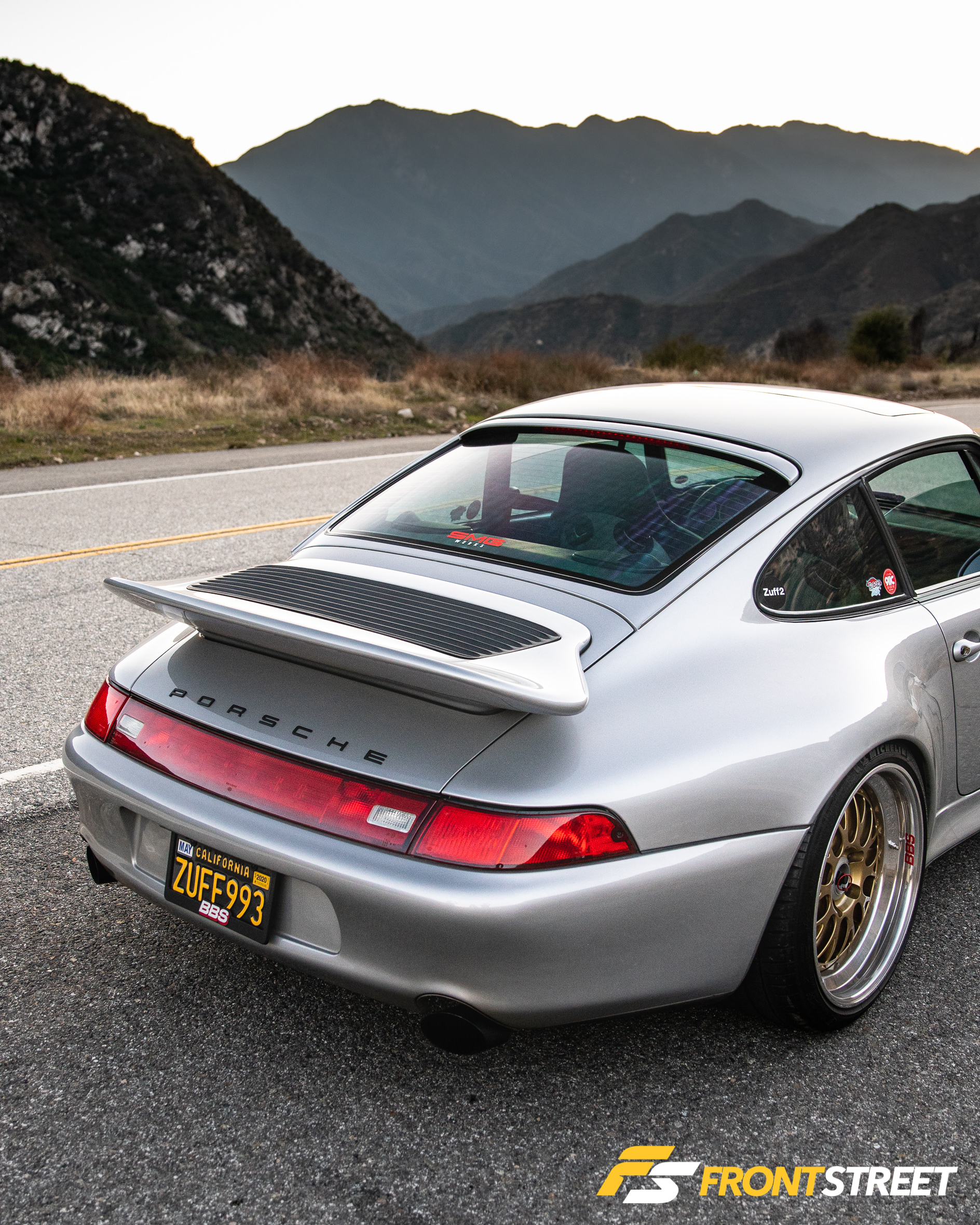 Of course, a high-performance car’s exterior needs to be equally as aesthetically beautiful as it is on the inside. So he started by lowering his 993 on a set of H&R Deep coilovers and then set the suspension up properly by upgrading to RS uprights, RS sway bars, RS motor mounts, and a Rothsport engine brace and bushings. Then he went with a set of BBS Motorsport E88 wheels with faces finished in traditional BBS Gold to set the stage, and with all things proper, finding the right offset is of the utmost importance. To fill the larger fender cavities of the 993, he opted to go with a 19-inch setup that resulted in a 9-inch and 11.5-inch front and rear width, respectively. The front wheels have an offset of ET38 with a 2-inch double lip wrapped in Michelin Pilot Sport 4S 235/35/19 tires, while the rears measure in with ET36 offset, a 3.5-inch double step lip, and tire sizing of 295/30/19. Wide butt 911s require wide tires, and wide tires are just so dreamy!