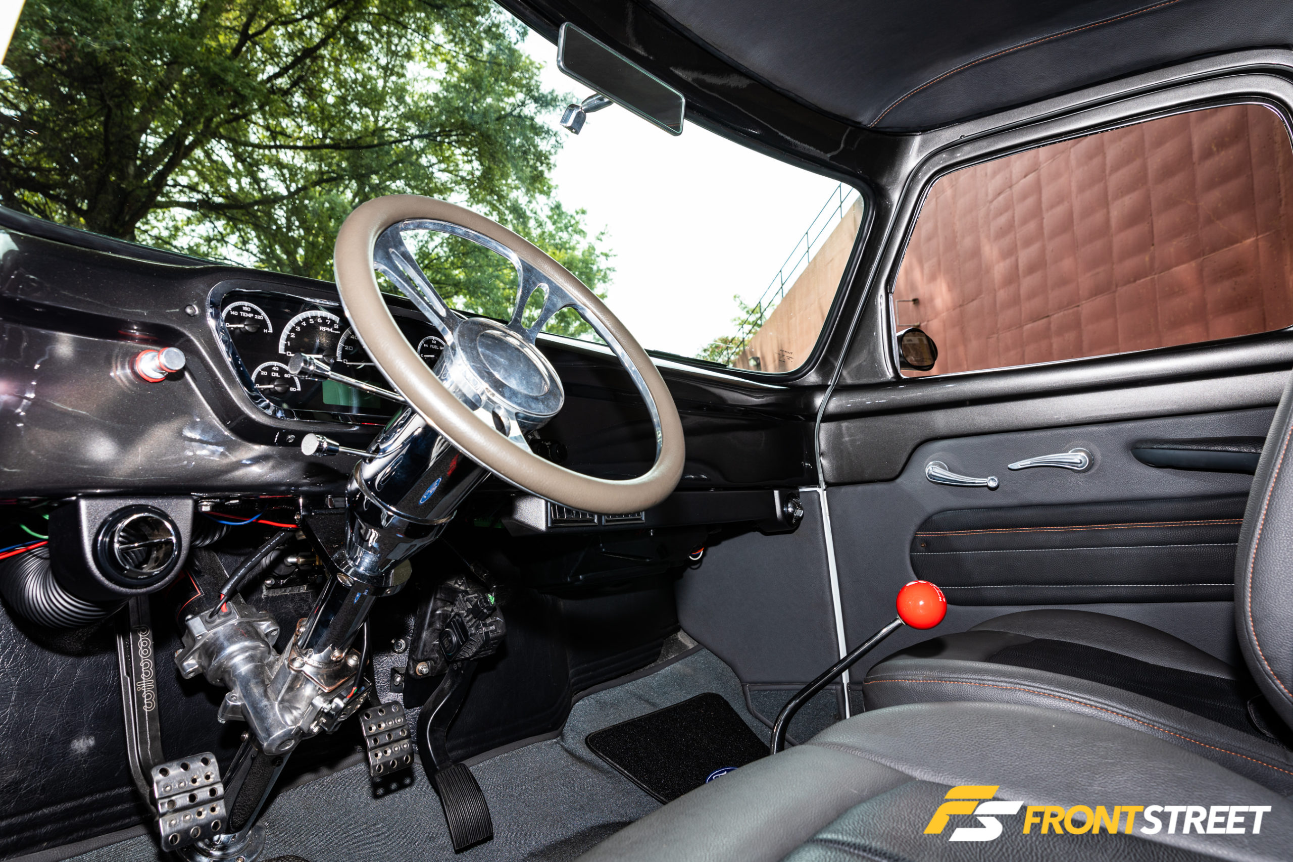 Upon opening the door, you immediately notice that all of the design cues and colors from the outside of the truck were also brought into the interior. The custom interior uses black and grey vinyl on the door panels, back wall, headliner, and seats. Daytona ‘50s style carpet covers the floor, and custom orange stitching adds a nice touch. Dakota Digital VHX series gauges are in place, allowing him to keep tabs on the particulars of the truck. A Unisteer electric steering column adds a modern touch making steering the agile resto-mod F-100 a breeze. Finishing off the interior, Billet Specialties supplied the steering wheel, window cranks, and door handles.