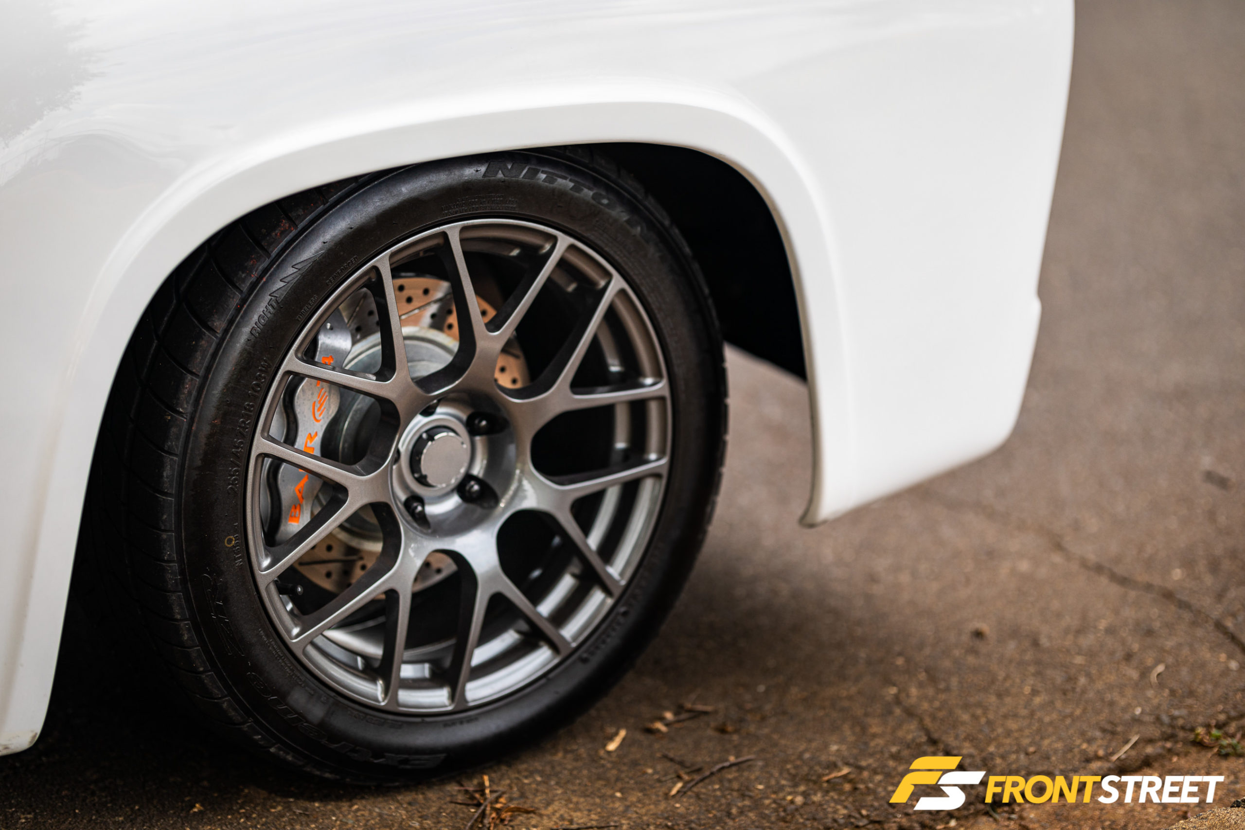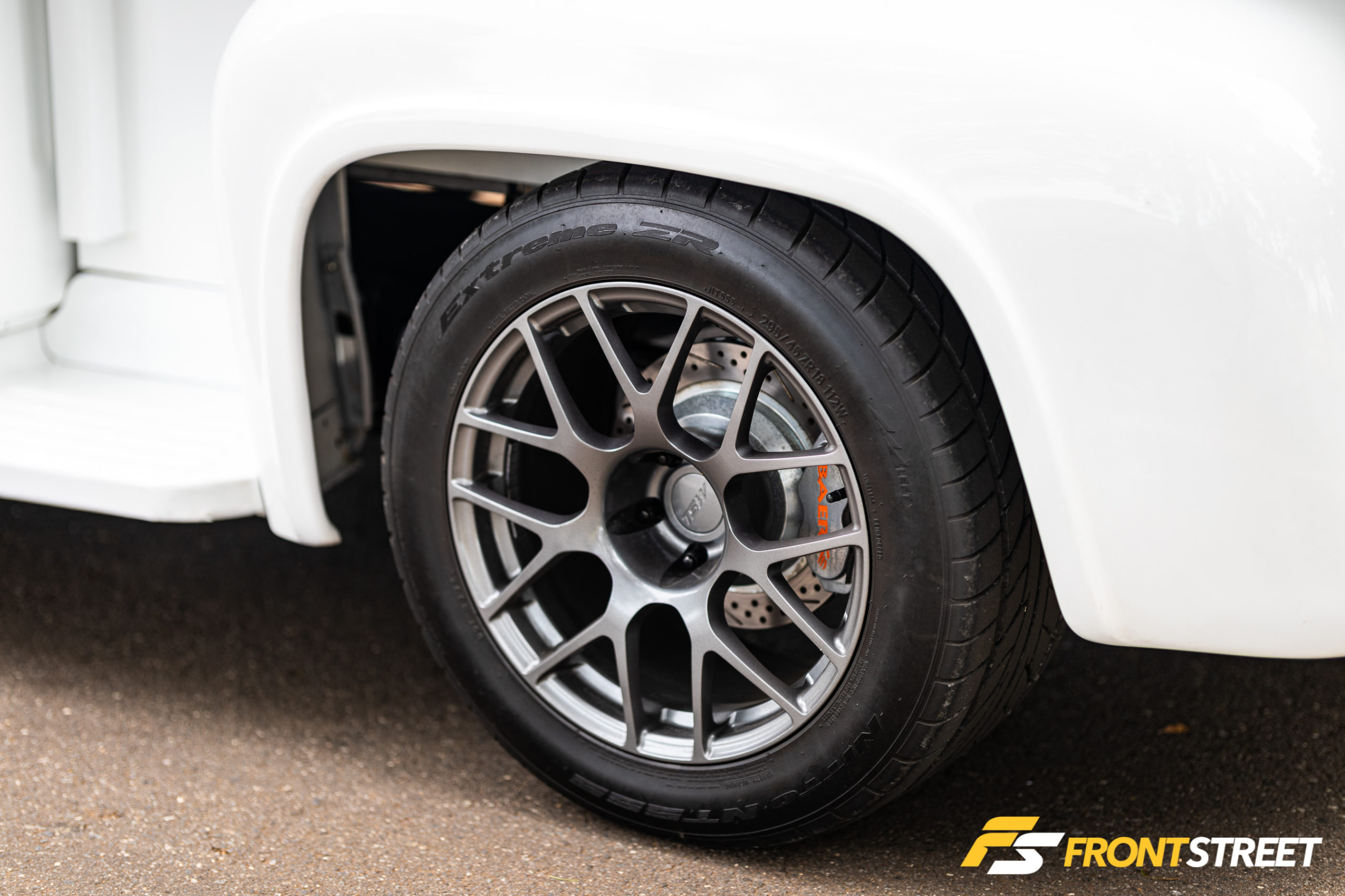 Under the F-100’s hood, you’ll find the twin-turbocharged 3.5-liter EcoBoost crate engine in Ford Performance trim, which produces 365 horsepower and 420 lb-ft of torque. That’s more than enough to get this vintage truck moving and far more than the 130 horsepower that was delivered by the truck’s original engine. The boosted setup needs to be intercooled, and Vibrant Performance supplied a custom intercooler and plumbing to keep that clean look. The same goes for the exhaust, with the turbos breathing through 3-inch custom bent stainless steel piping. Backing the boosted powerplant is an American Powertrain TREMEC TKO600 five-speed manual transmission, which gives Sutton complete control of the truck’s power and performance. Scott Bowers of Ron Francis Wiring set the truck up with his company’s components to ensure each of the pieces could communicate properly over the electrical network; he tucked the wiring so clean that it’s as if it’s not even there. Power gets to the ground by way of TSW Nurburging 18-inch wheels wrapped in 295/45ZR18 Nitto NT555 tires in the rear, while the 245/45/ZR18 variant sits out front.