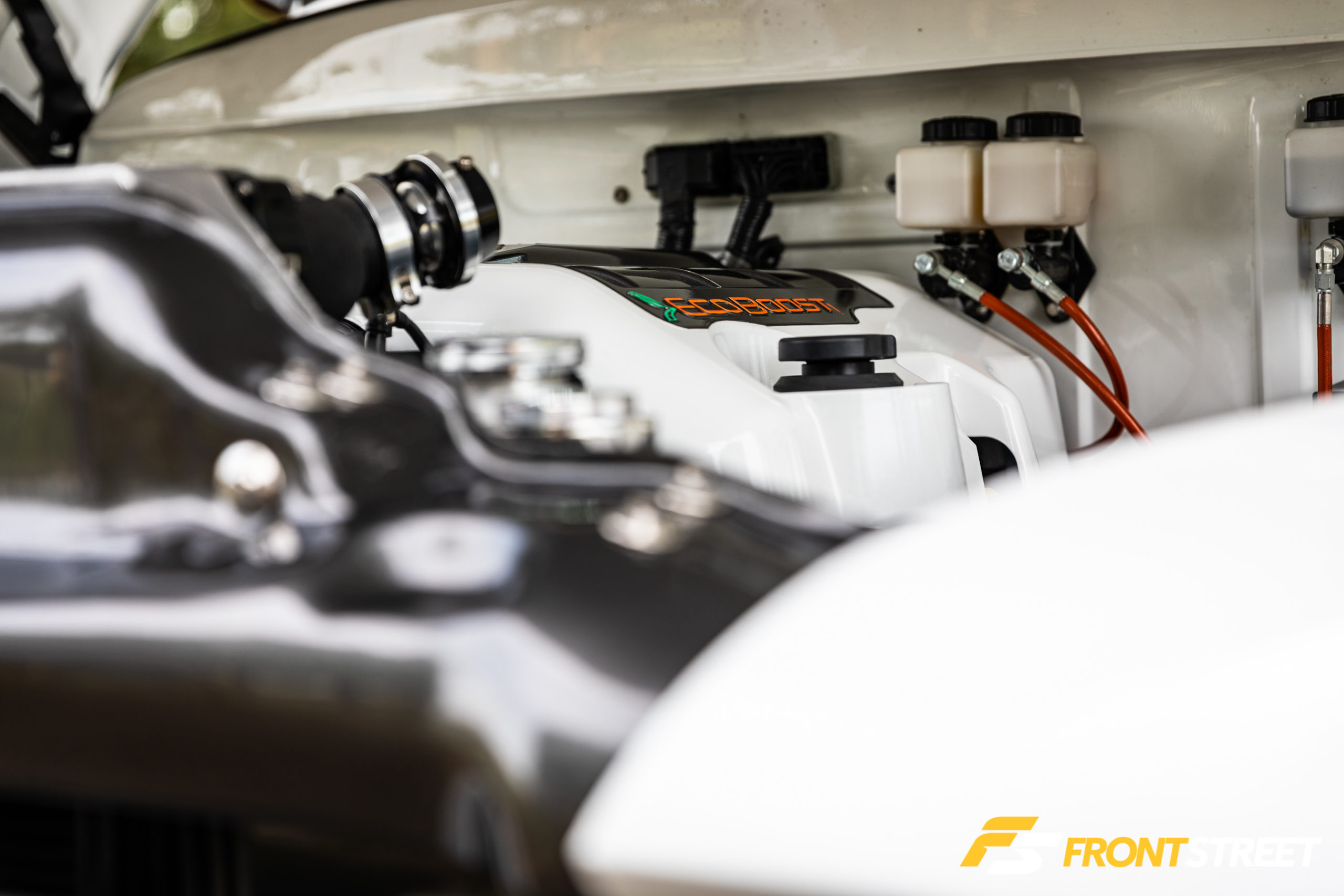 Another trend among the F-100 crowd is the resto-mod, which references crossing today’s tech and drivetrains with yesteryear’s sleek body lines. This particular specimen is indeed a resto-mod in almost every way. As I walked through classics lining a small town cruise-in, I was drawn toward Sutton’s white ‘55 because of its unique stance. Peering into the engine bay, I found the EcoBoost badge across the cover and grinned immediately.