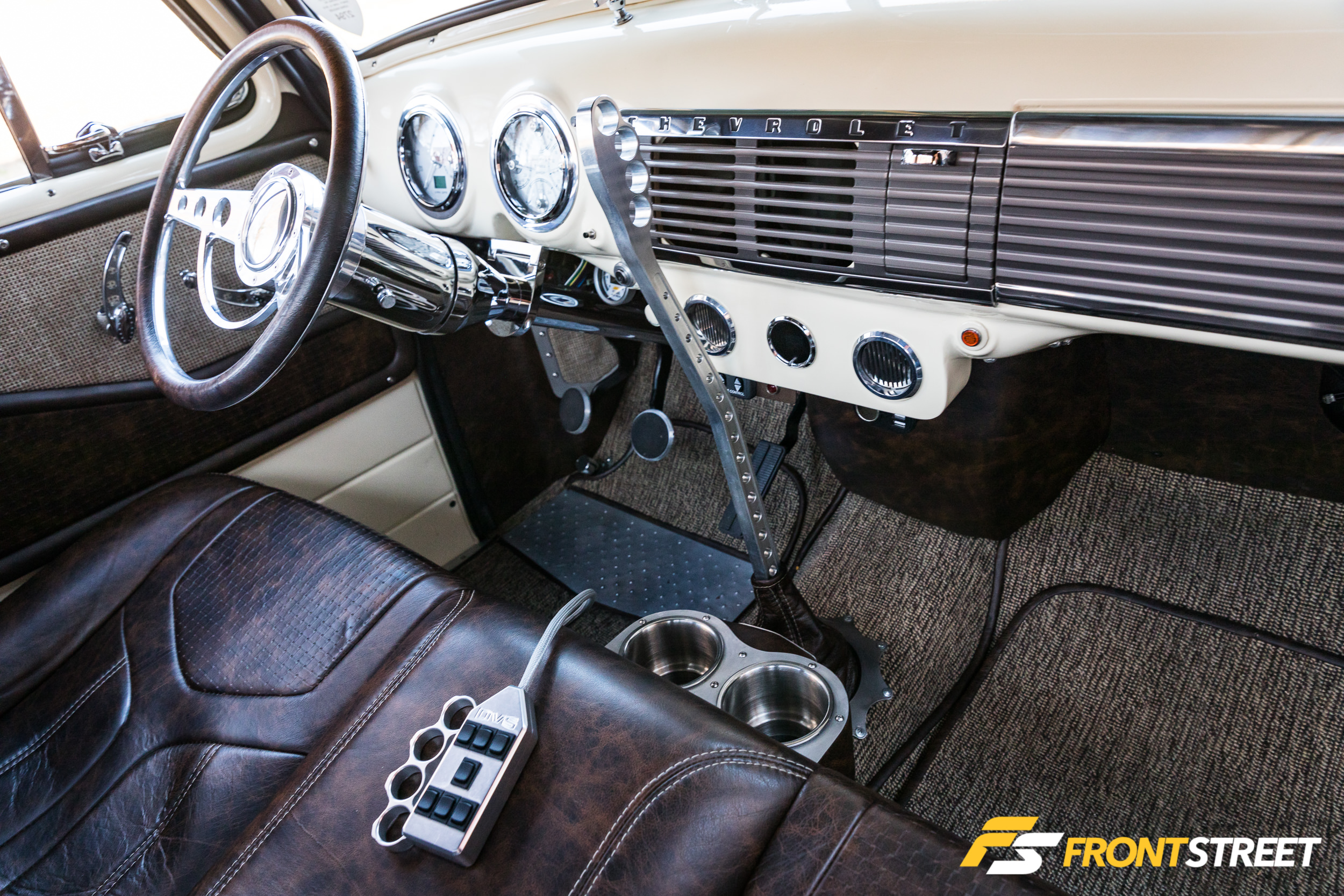 Chris and his family put just as much time into the interior of the 3100 as they did to the exterior and powertrain, and it’s equally as stunning. The work—all of it, right down to the wiring—was done by either him or by a family member. When sitting behind the wheel, you hold onto a Billet Specialties steering wheel, while sitting on a repurposed nightshade leather-covered bench seat.