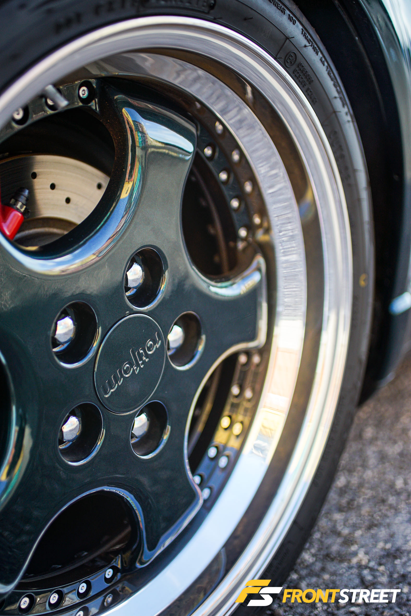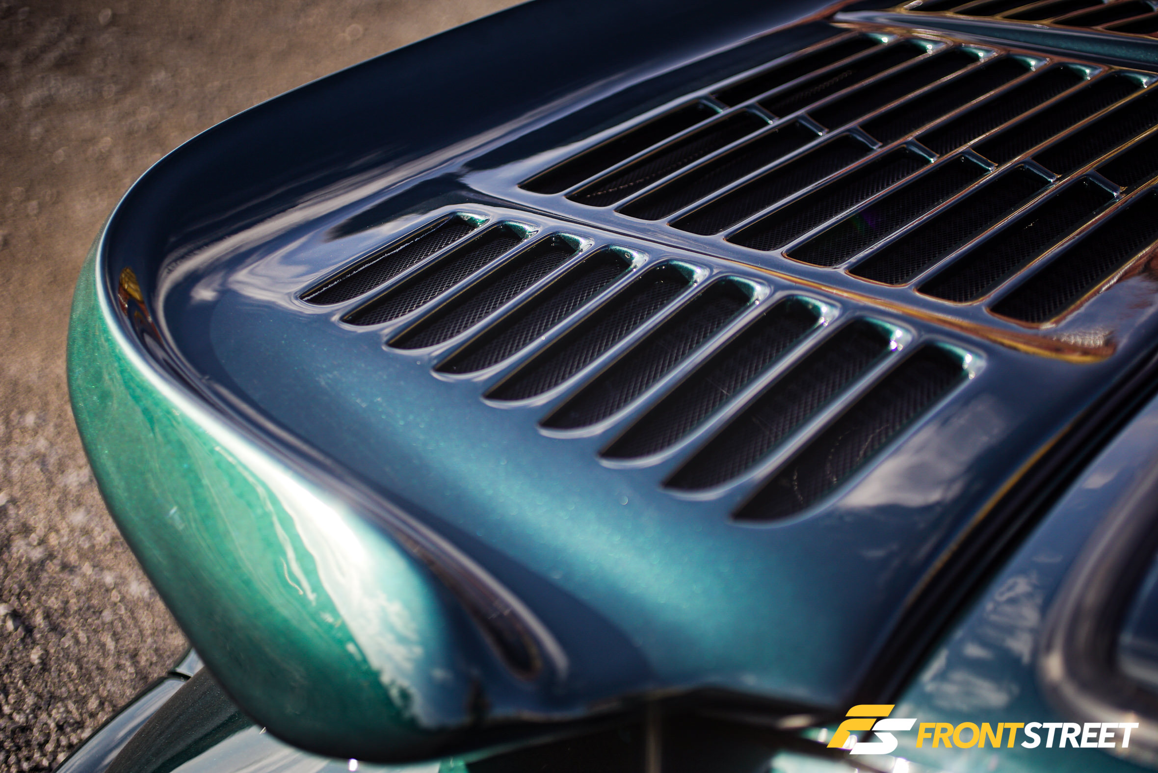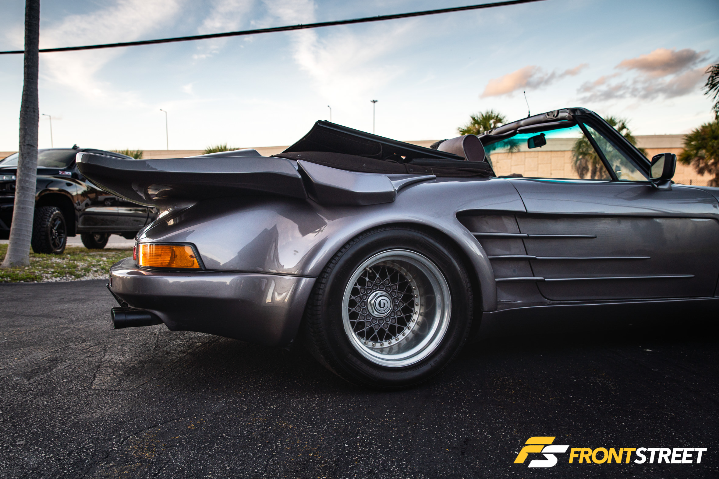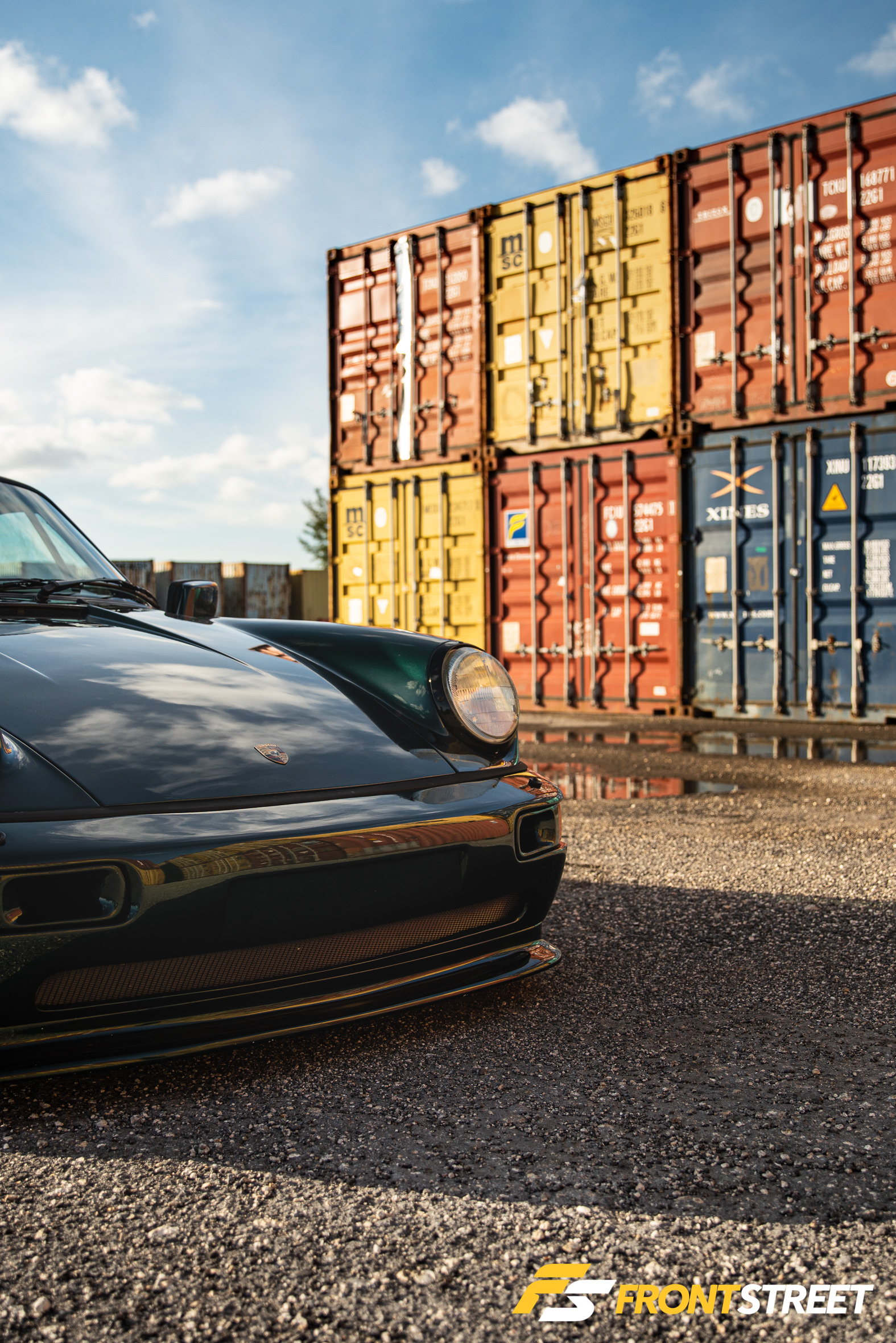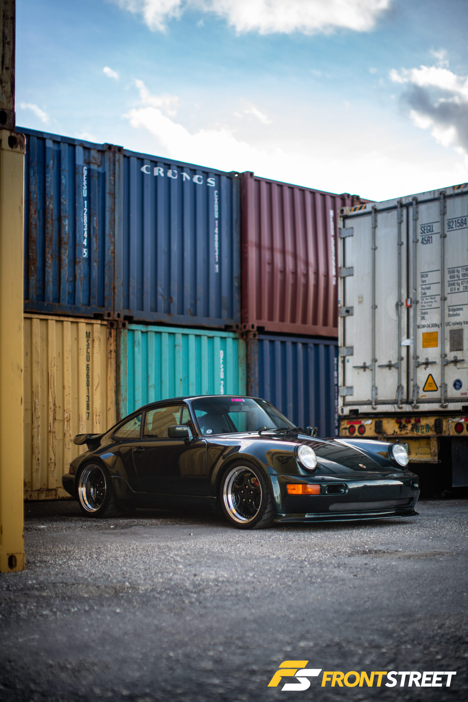The next morning we took it out for a lone feature by an open trailer lot. Now, some 964 widebodies look very strange as their owners incorrectly lower them, and the wheel gap is very present and too spacious. I have a saying, “Say no to wheel gap,” as I believe it creates a visual tension that ruins the look of the car, but that is just me. This 3.3 was lowered to the perfect height and demanded your attention. It was fitted with matching Forest Green Rotiform wheels that complement the car perfectly.