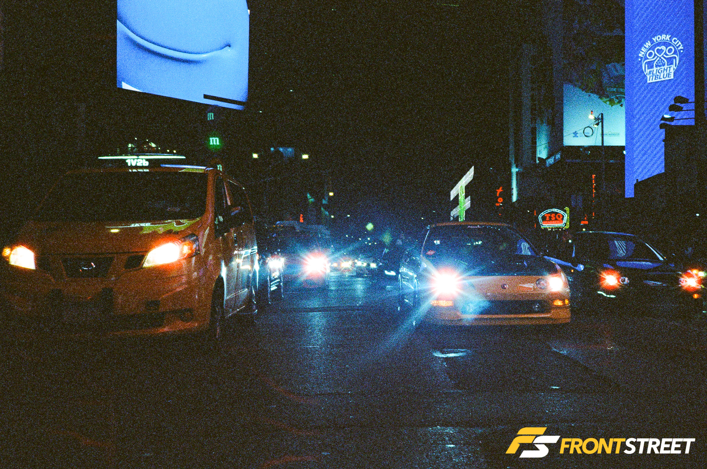 Upon leaving, a close friend informed me that Edwin Reyes, co-founder of PrimeNYC, had organized a select group of vehicles to follow him and cruise through Times Square. Now that the police barricades were no longer in place, the cars could travel the intended route. Sadly, by this time of night, I’d shot through my last roll of Cinestill 800T. I could only find a roll of Ultramax 400 in my camera bag, so I loaded that into my camera and settled for at least being able to get photos of this, even though it wasn’t in my preferred stock.