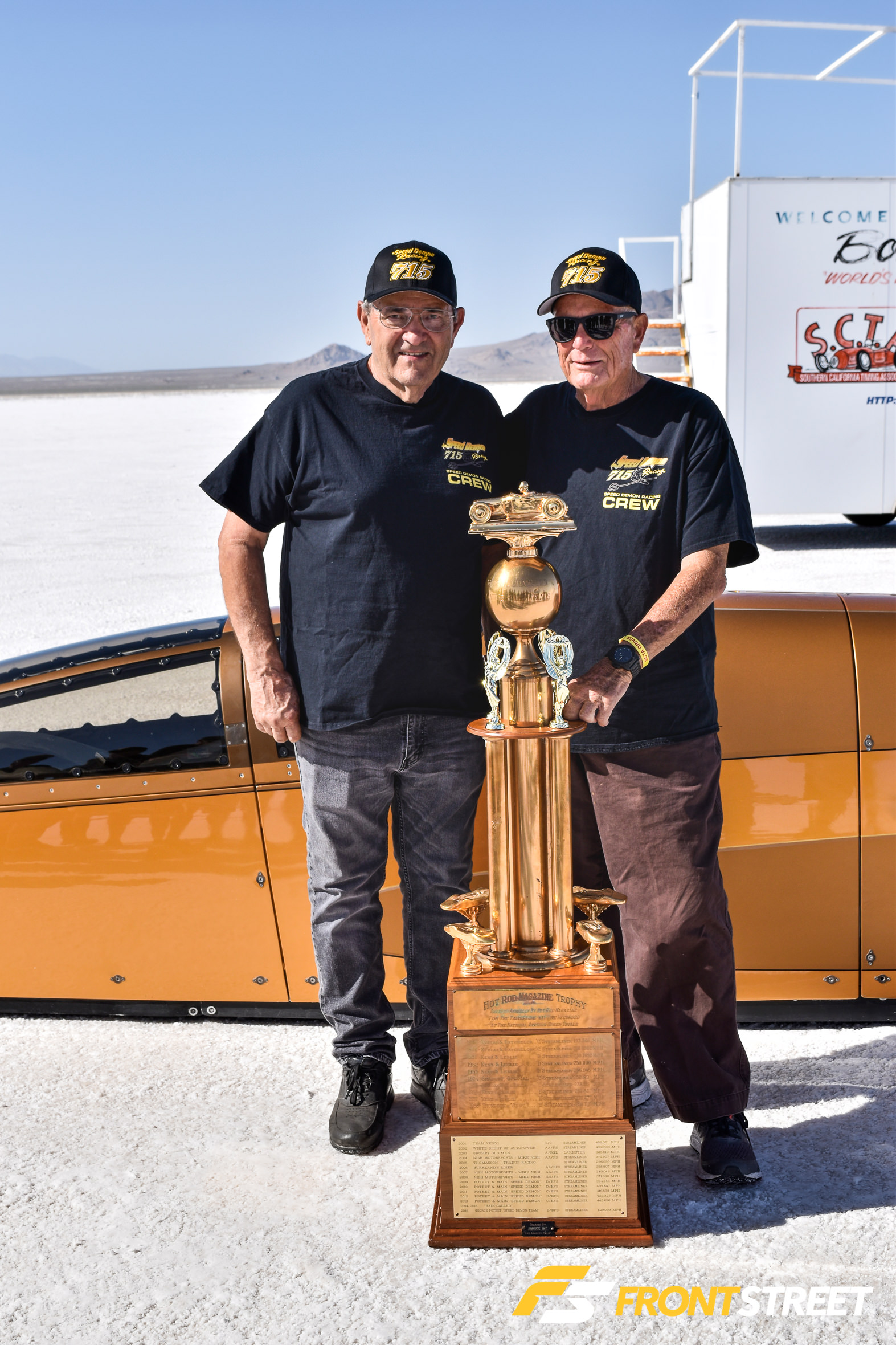 Late Monday afternoon, they qualified for the AA/BFS record with a speed of 428.182 mph. Tuesday morning, they finally set the new record to 439.246 mph based on a 450.311 fifth mile average combined with the previous day’s qualifying speed. Still, Poteet and the team were not satisfied. The engine builder, Kenny Duttweiler, knew there was plenty of speed left in the combination. George wanted to set a record well over 450 mph to reclaim the title of the fastest piston-powered car. That title was held by Danny Thompson, who drove the Challenger II AA Fuel Streamliner to a 448.757 mph record in 2018.