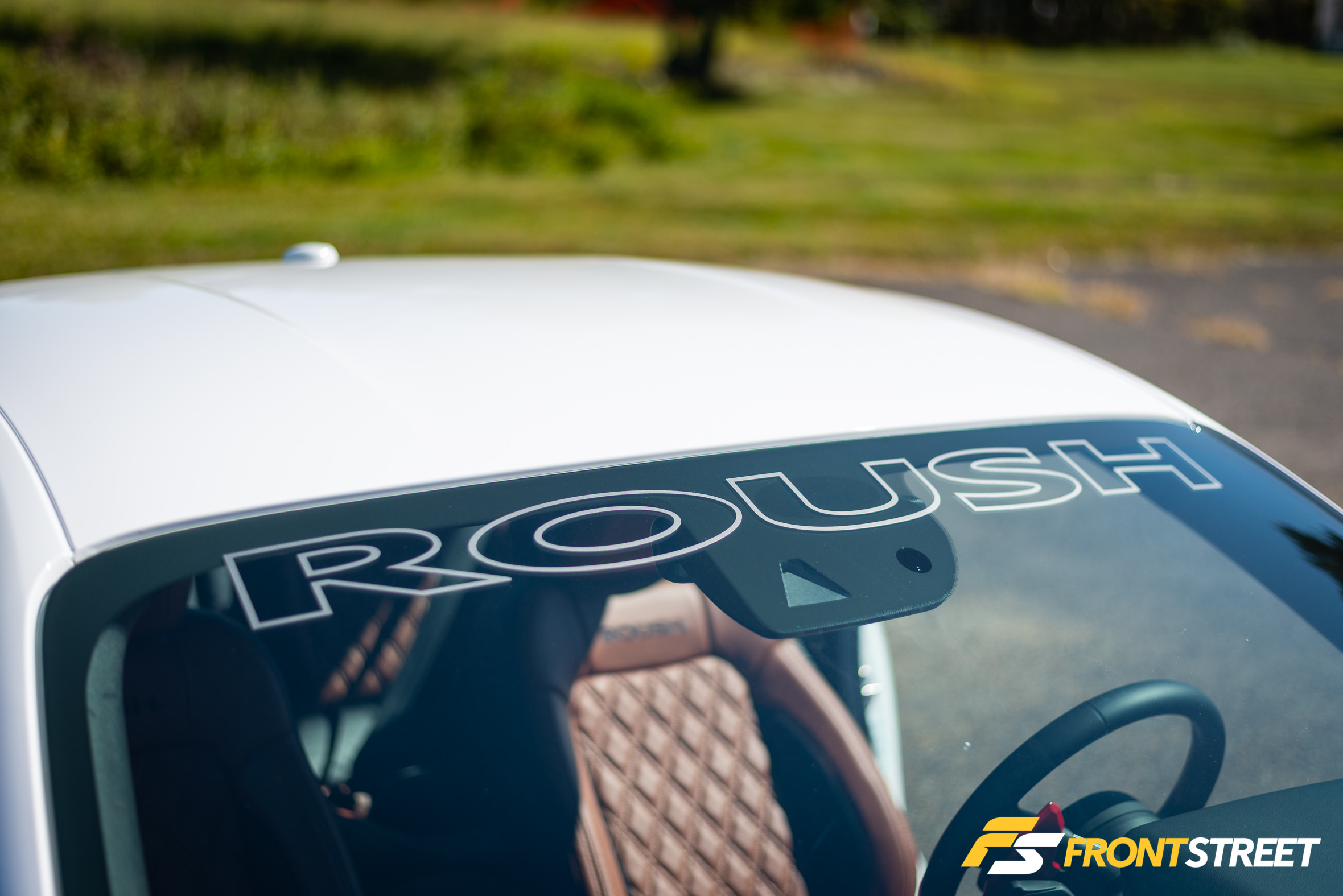 So what’s involved in the ROUSH Stage 3 Signature Package? First, let’s start with the looks. I think the S550 chassis, in general, is a massive leap forward for the Blue Oval. However, the ROUSH engineers magnified it further with a host of extras on their R9 Aero body kit. They thought of everything to enhance the exterior of this stunning Oxford White example, and it shows. The simple yet pleasing RS3 emblem in the blacked-out ROUSH upper grille cleans up the fascia using the rule of thirds. The tasteful and functional front chin spoiler doubles as a splitter that extends under the engine bay, initiating the front end’s aggression and providing alluring downforce. The wheel shrouds keep clean airflow from being disturbed by the rotating wheel and tire package, while high-flow corner pockets regulate heat extraction in the fenders and hood alike.