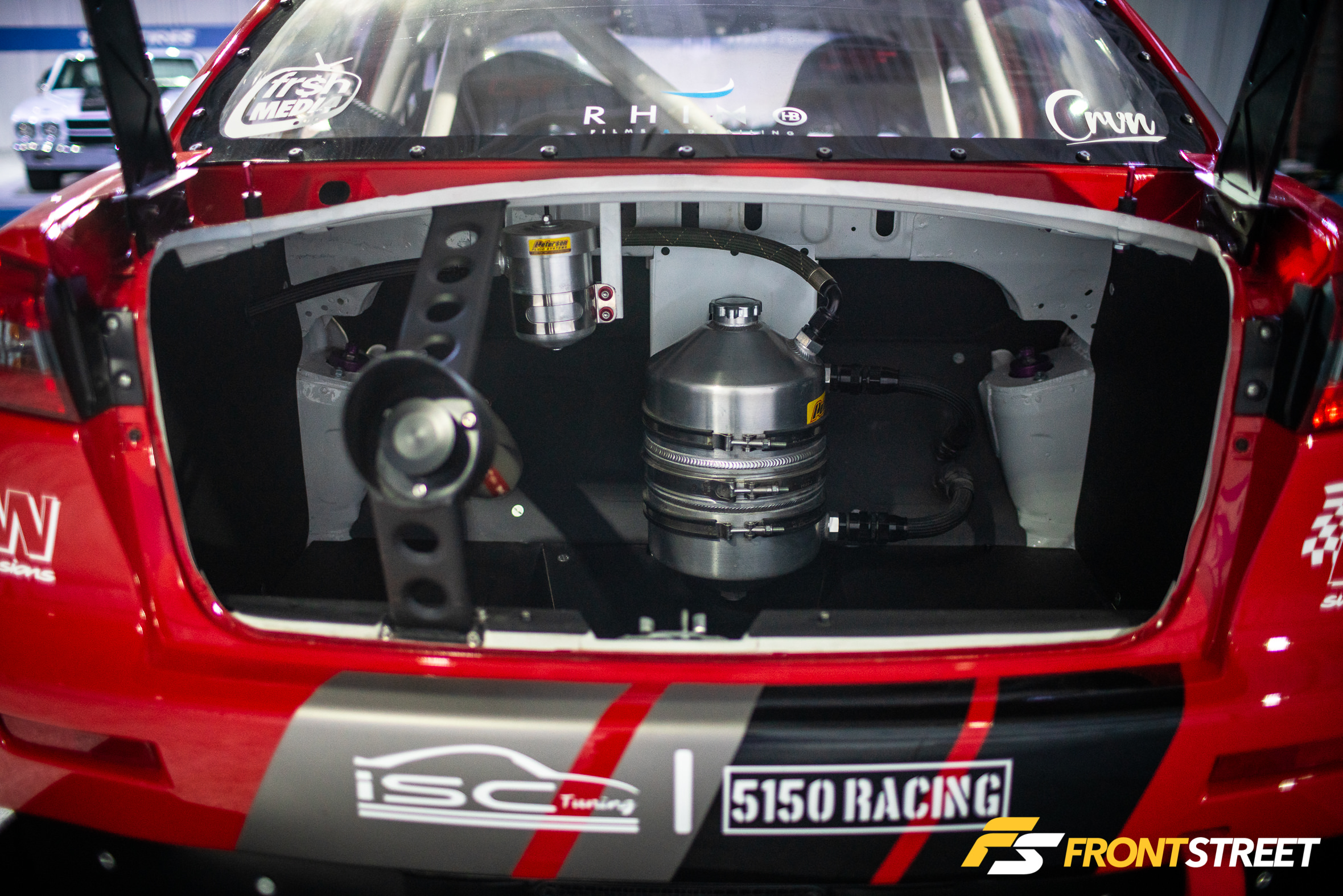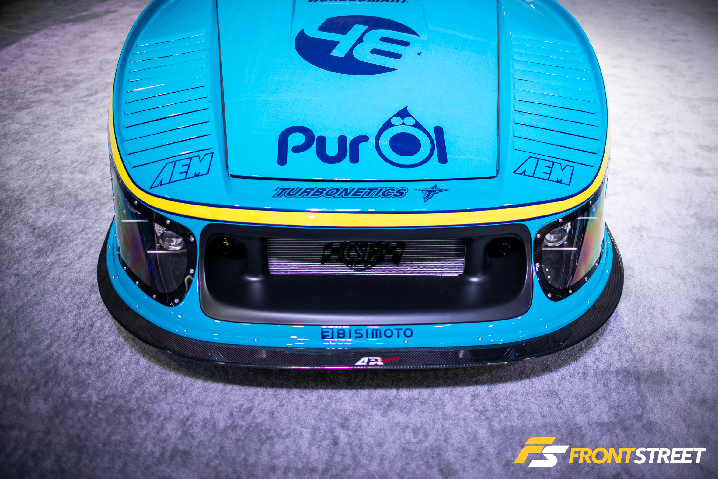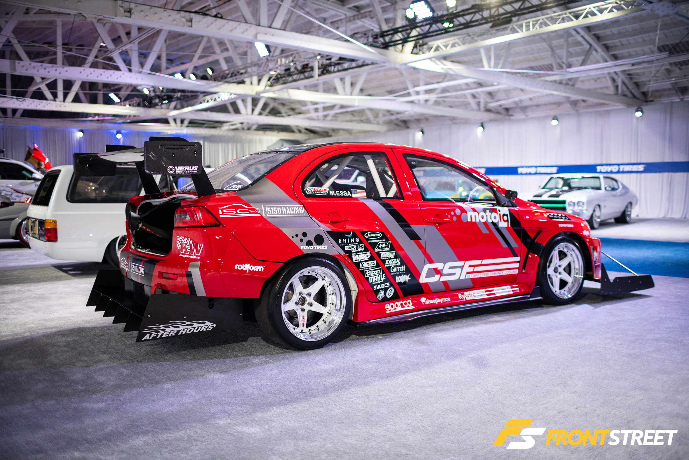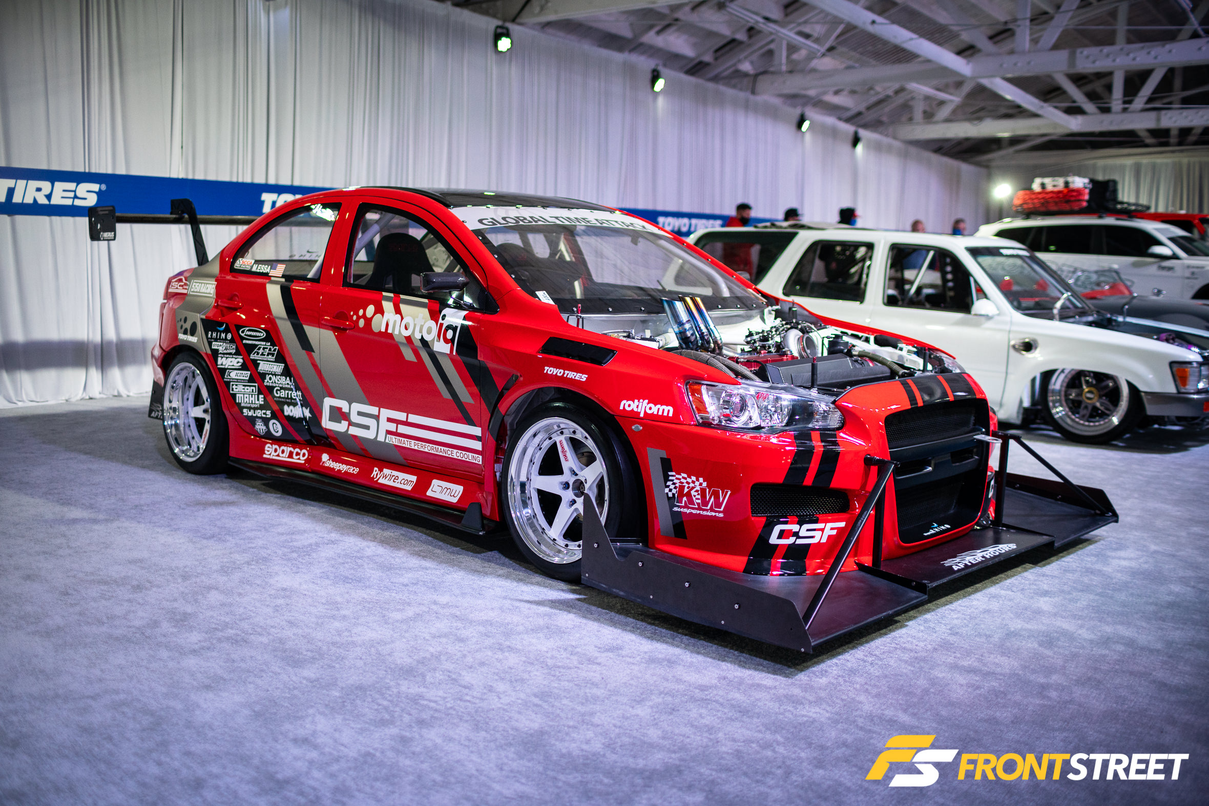 Ravi Dolwani from CSF Performance isn’t new to building high-speed cars. Loyal readers will remember his Porsche 991 Turbo half-mile car we featured right here on Front Street. Back for a second go-round, this Evo X from our good friends at CSF Performance is ready to go for a tear — again. Not to be confused with its first iteration showcased two years ago at the SEMA Show, this new build of the same chassis started all over from the ground up. We liked seeing products from Turbosmart in the engine bay, and the Rotiform wheels with wide 275/35/R18 Proxes RS1 rubber were a nice touch, too. As pretty as it is sitting under the lights, the car is meant for track time. In fact, just a day or so after this event, Michael Essa piloted this Ferrari red-painted, big-aero-having, powerhouse around the Buttonwillow Raceway Park course in the Global Time Attack Finals — more on that another time, though.