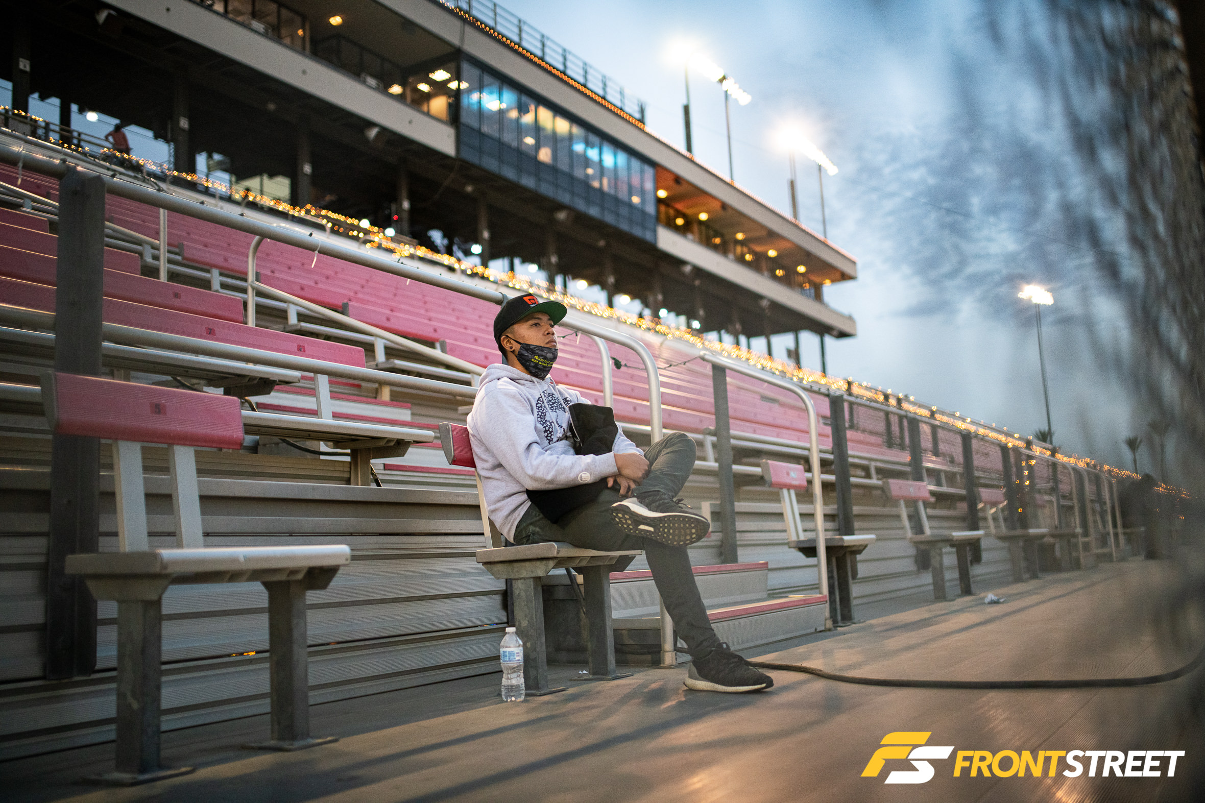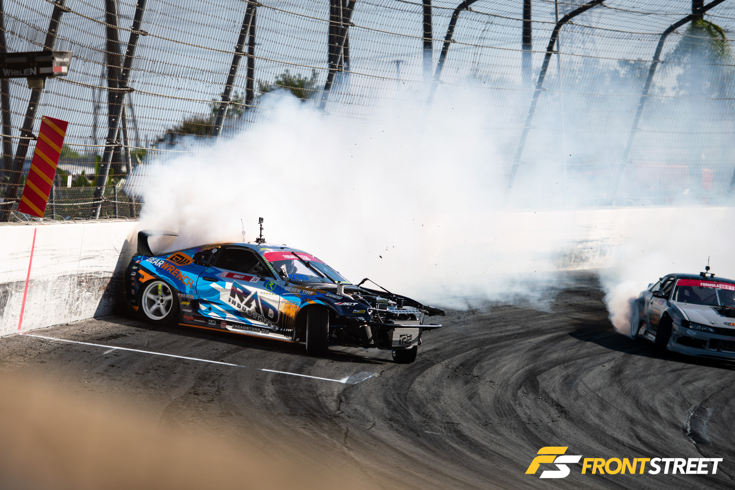 Irwindale is a tumultuous round for many reasons, especially in these later months as its track surface cools once the sun sets behind its banked oval walls. The same walls claim countless cars when drivers don’t stay on their A-game. Tuerck suffered such a fate when leading against Travis Reeder in Top 16. Tuerck locked up his front wheels on the cool pavement after initiation, contacting the wall and necessitating a lengthy repair to the Corolla for the following day.